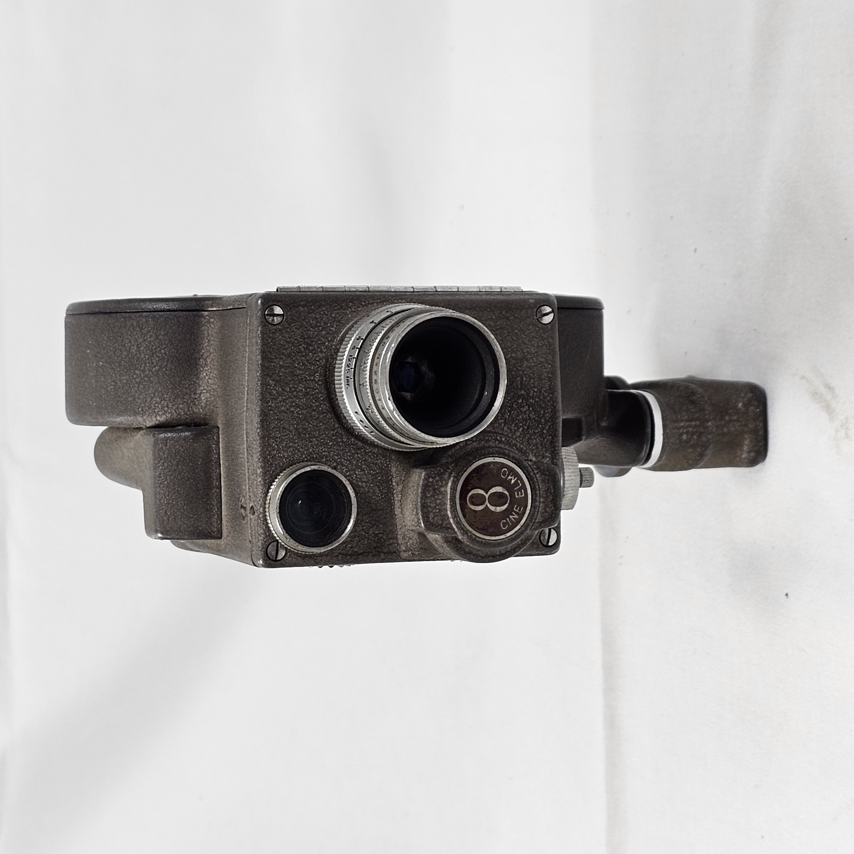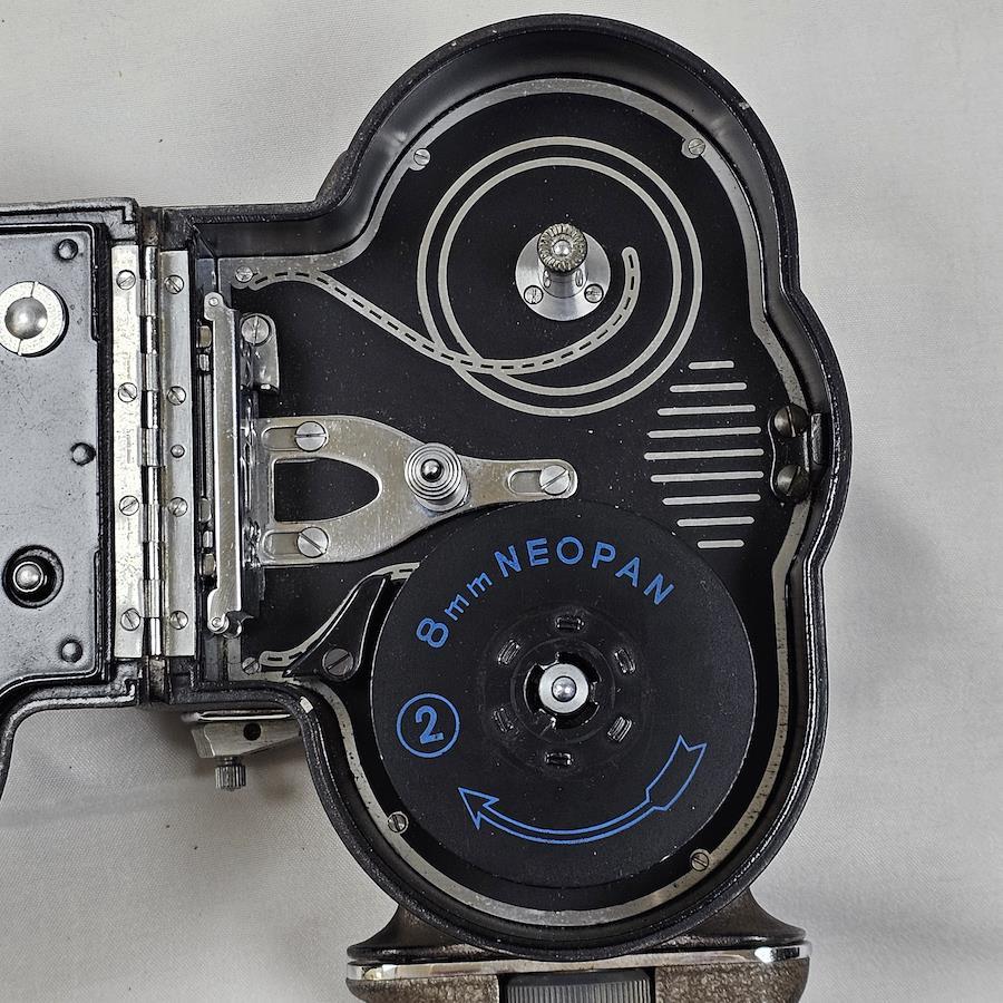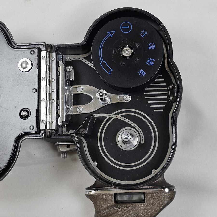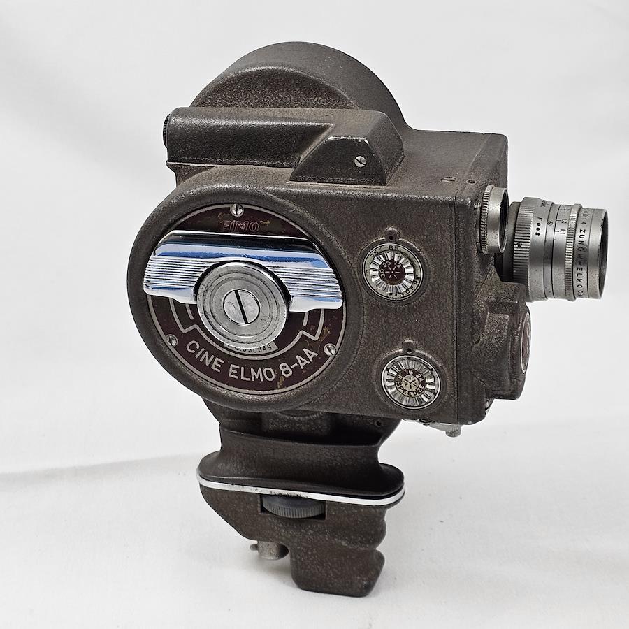 昭和レトロな雰囲気を醸し出す、エルモ製の8ミリカメラ「シネエルモ8-AA」です。クラシカルなデザインとゼンマイ式駆動が特徴で、昔の映像機材に興味がある方や、レトロなインテリアのアクセントをお探しの方におすすめです。