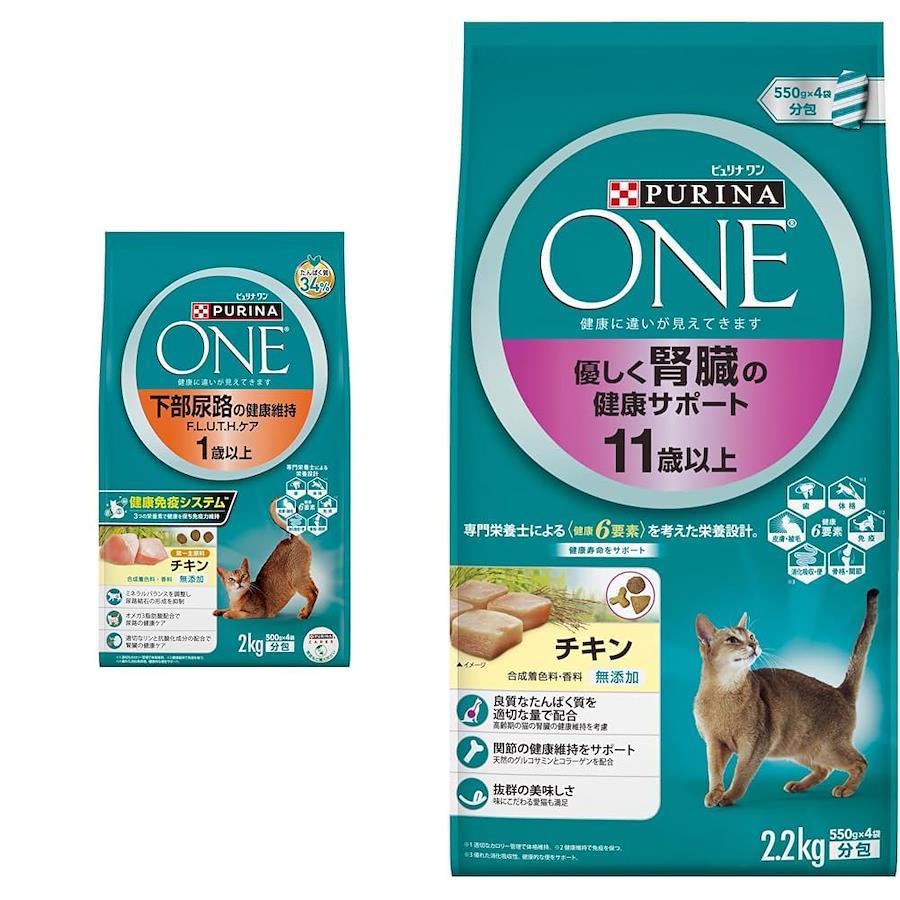 ピュリナ ワン ドライ 高齢猫用(11歳以上) 優しく腎臓の健康サポート チキン 2.2kg(550g×4袋入) [キャットフード]●愛猫の健康と成長のために必要な全ての栄養素がバランスよく含まれているだけでなく、高い栄養価、優れた消化吸収そして抜群の美味しさをも兼ね備えたプレミアムニュートリション・キャットフード。●高品質で新鮮な原材料を使用し、抜群の嗜好性と優れた消化吸収をサポート。●いつも新鮮な550gの分包パック。●良質なたんぱく質を適切な量で配合し、高齢期の猫の腎臓の健康維持をサポート。天然グルコサミンとコラーゲン配合で関節の健康維持をサポート。