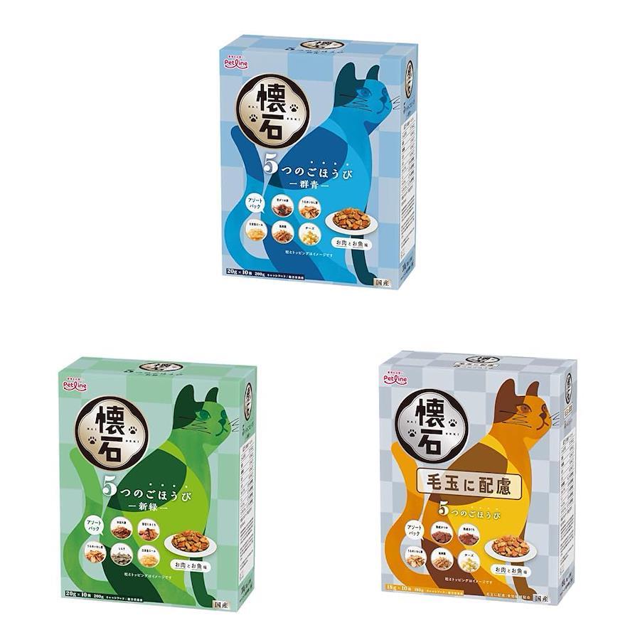 ペットライン 懐石 5つのごほうび 新緑 キャットドライ グルメ【 国産/小分け/トッピング】 200g今までの懐石を超える"至福の美味しさ"。毎日のごはんや、とっておきのおやつ、トッピングにおすすめ。それぞれトッピングされた5種類の小分けアルミ蒸着分包が、20g×10本入りで美味しさをキープ。酸化を防ぎ風味を保つ脱酸素剤入り。