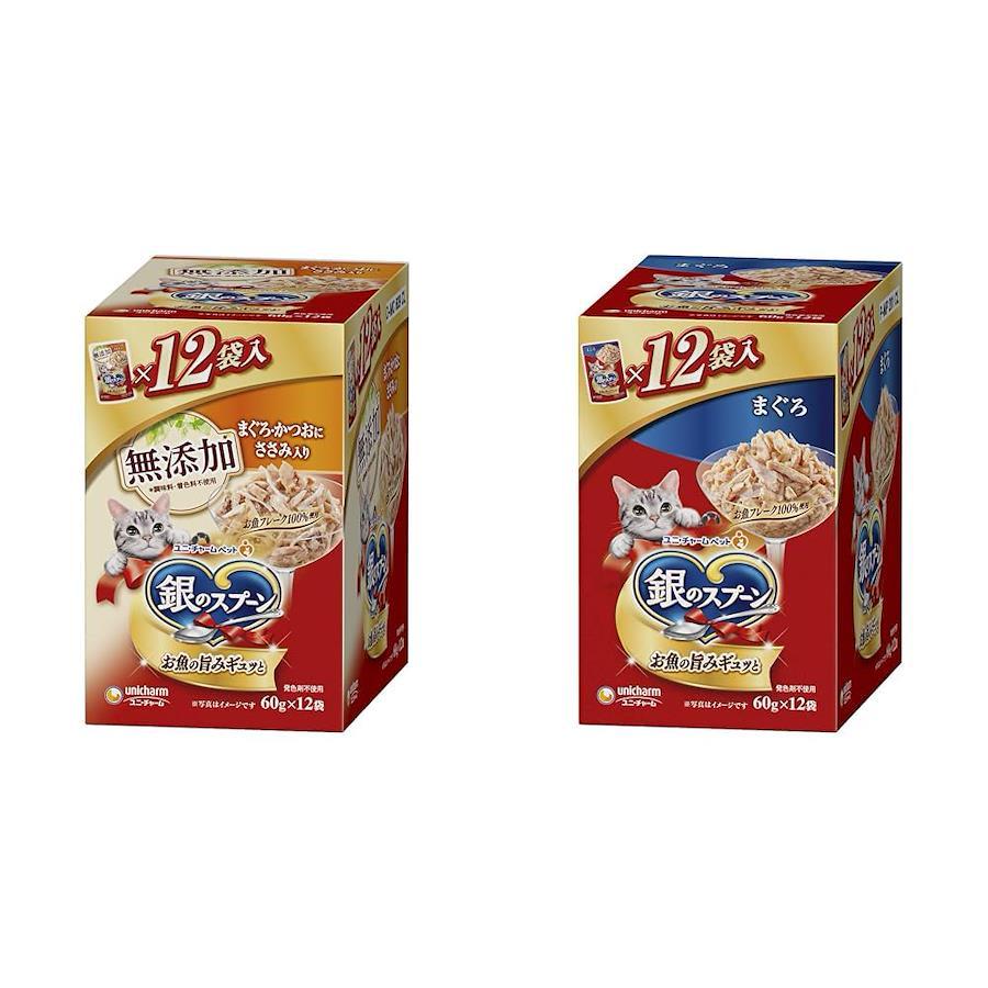 銀のスプーン キャットフード ウェット パウチ 無添加まぐろ・かつお・ささみ入り 60g×12袋 ユニチャーム・たっぷりお魚フレーク100%使用とお魚のうまみで抜群のおいしさを実現 ・ねこが大好きなやわらかゼリータイプ ・調味料、着色料、発色剤不使用 ・60gパウチが1箱に12個入ったパック