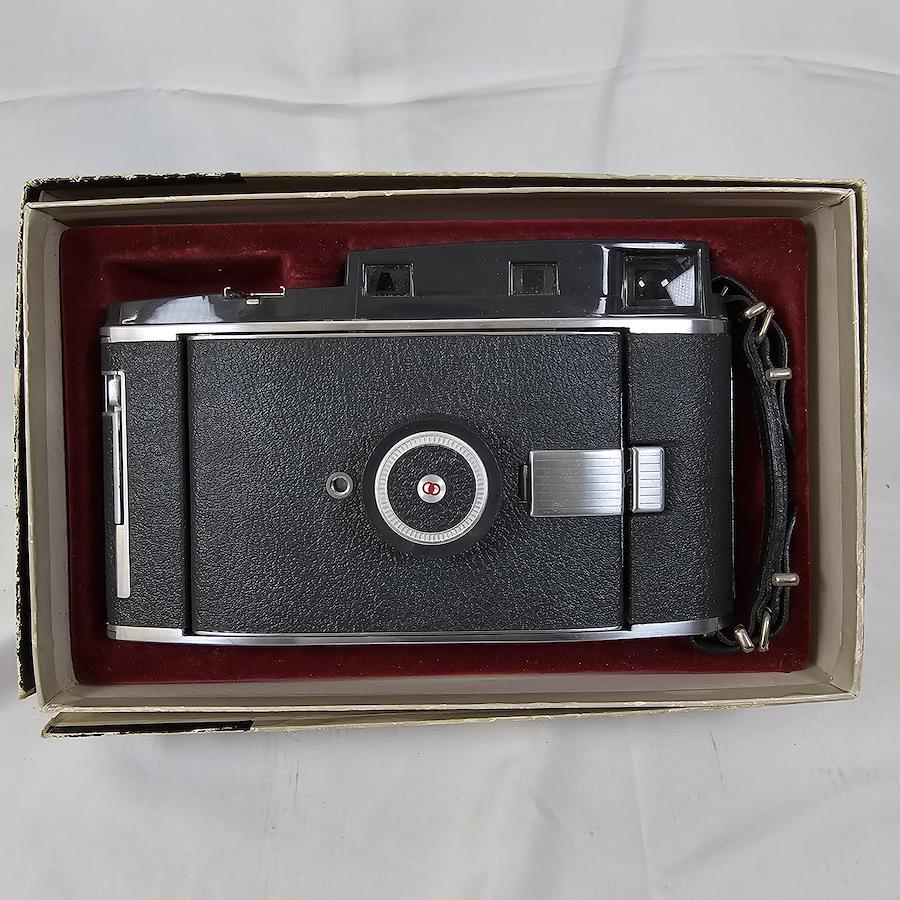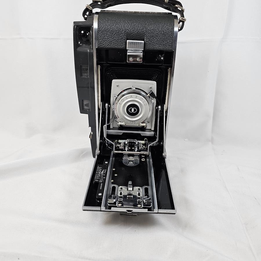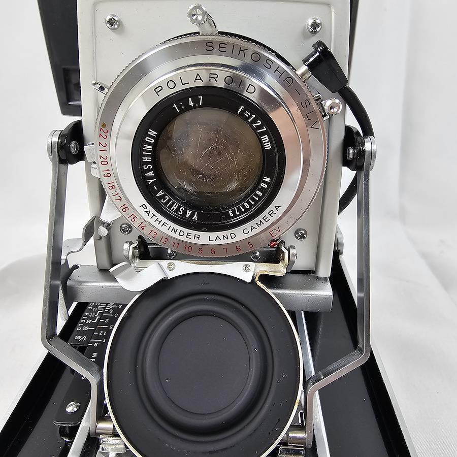 1961年に発売されたPolaroid(ポラロイド)のインスタントカメラ、「Pathfinder Land Camera Model 120」です。クラシカルな蛇腹(ベローズ)式のデザインと、美しい造形が魅力のヴィンテージカメラ。シャッターには「Seikosha SLV」レンズが搭載されており、当時の技術とデザインが詰まった逸品です。