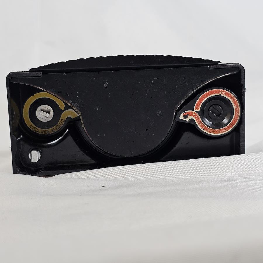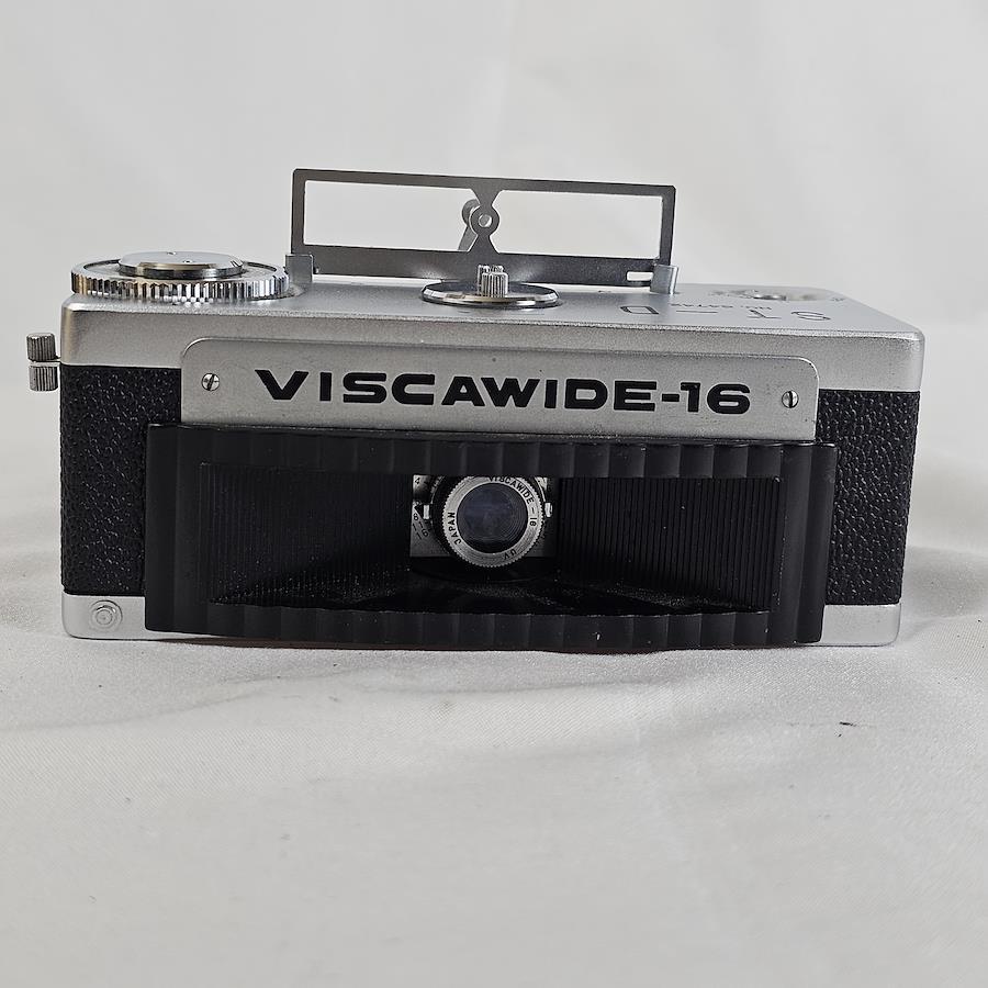 - モデル名: VISCAWIDE-16- ISO感度設定: ISO 100- 絞り設定: f/3.5- シャッタースピード設定: 1/30, 1/60, 1/125, 1/250- デザイン特徴: 黒いレザー調のボディ- 特記事項: フィルムカメラ