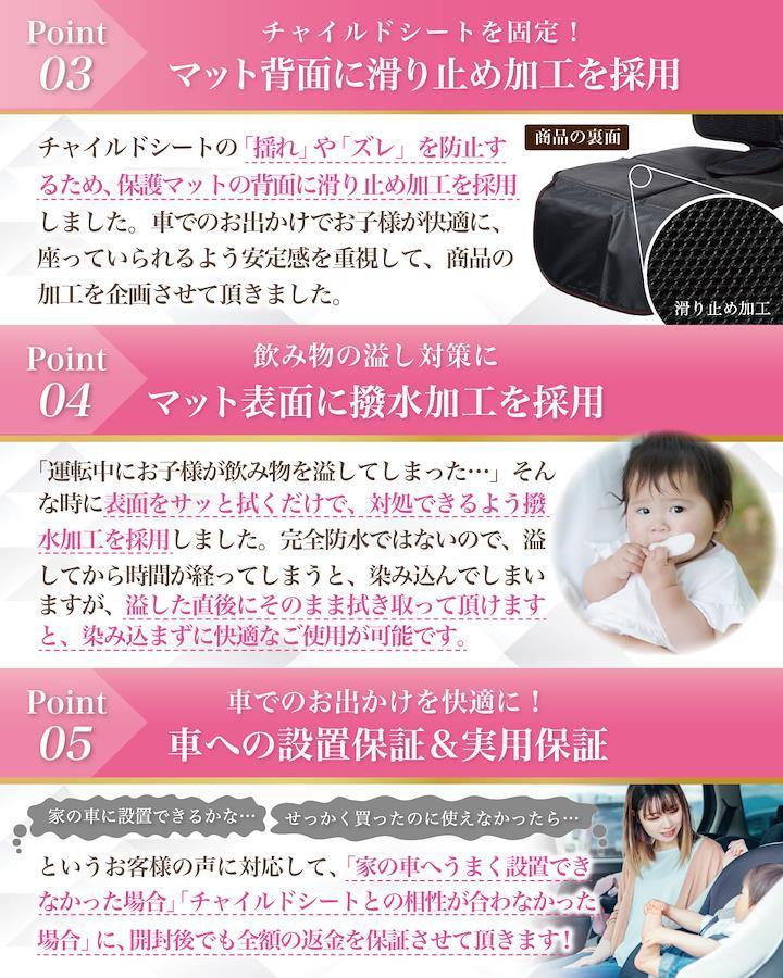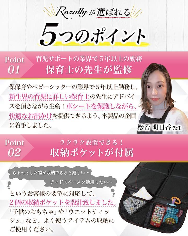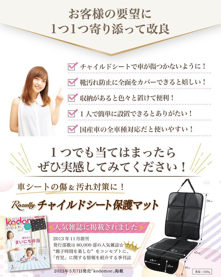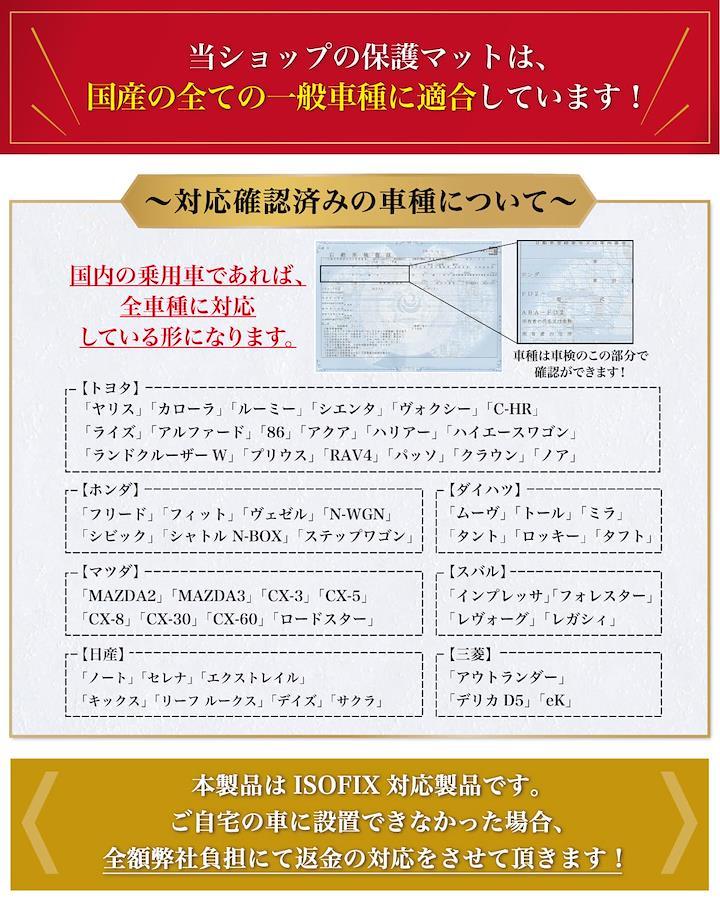 【保育士が監修】 Rozally チャイルドシート 保護マット がついに正式販売開始。 「チャイルドシート の設置で 車 の シートカバー が傷つく…」というお客様の声から生まれた ISOFIX対応 の 座面シート (座面カバー) で 凹み防止 & 汚れ防止 を実現する チャイルドシートマット (保護シート) です。 チャイルドシート や ジュニアシート での”傷防止”や”傷 保護”設置をメインターゲットに ISOFIX 対応 という設計で チャイルドシート保護マット を企画させて頂きました。 企画&設計では 新生児 や 乳幼児 の育児に詳しい【保育士】の先生からアドバイスをもらい、 チャイルドシート 保護マット の簡単設置方法 などフルイラスト説明書として添えさせて頂きました。 【こだわり】様々なメーカーから チャイルドシート用 や ジュニアシート用 の保護シートとして” チャイルドシートマット ”が販売されていますが、Rozallyのチャイルドシート保護マット は”こだわり”が一味違います。 車用品をメインに取り扱っている10社以上の工場からサンプルを取り寄せ、「傷つき防止×汚れ防止」を一緒に試行錯誤して頂けた1社に絞って発注を行なっています。 【製品の長期保証】 Rozally チャイルドシート 保護マット は品質にこだわり、工場と交渉をおこなって素材選定から進めています。出荷前の検品などは十分に行わせて頂いているのですが、輸送中に破損や汚れは混じってしまうケースがあります。不具合などが発生してしまった場合でも、製品には長期保証を付属させて頂いておりますので、すぐに交換品の手配をさせて頂きます。また本製品には使いやすさや快適さを実感して頂くことを最優先に考え、「2週間ほどなかなか上手く使用できなかった」という場合に、”開封後”でも”使用済み”でも全額の返金保証を付属させて頂いております。 【対応の車種一覧1】 弊社の商品では ISOFIX対応 となっていることから、 国産車の全てに対応している形で企画しています。 設置できない場合がありましたら、 返金保証の対象となりますので、 お気軽のショップまでお問い合わせください。 ※お問い合わせでよく頂く車種に関して、 下記に一覧として記載をさせて頂きます。 【トヨタ】 ヤリス、カローラ、ルーミー、シエンタ、アクア、ノア、ヴォクシー、ライズ、アルファード、ハリアー、ランドクルーザーW、プリウス、RAV4、パッソ、クラウン、C-HR、86、ハイエースワゴン 【スズキ】 ソリオ、スイフト、ジムニーワゴン、クロスビー スペーシア、ワゴンR、ハスラー、アルト、ジムニー 【ホンダ】 フリード、フィット、ヴェゼル、ステップワゴン、シビック、シャトル N-BOX、N-WGN 【日産】 ノート、セレナ、エクストレイル、キックス、リーフ ルークス、デイズ、サクラ 【マツダ】 CX-5、MAZDA2、CX-60、CX-30、MAZDA3、CX-8、ロードスター、CX-3 【対応の車種一覧2】 弊社の商品では ISOFIX対応 となっていることから、 国産車の全てに対応している形で企画しています。 設置できない場合がありましたら、 返金保証の対象となりますので、 お気軽のショップまでお問い合わせください。 ※お問い合わせでよく頂く車種に関して、 下記に一覧として記載をさせて頂きます。 【ダイハツ】 ロッキー、トール、ムーヴ、タント、ミラ、タフト 【スバル】 インプレッサ、フォレスター、レヴォーグ、レガシィ 【三菱】 アウトランダー、デリカD5、eK 【レクサス】 NX350H