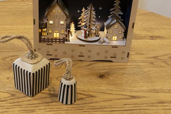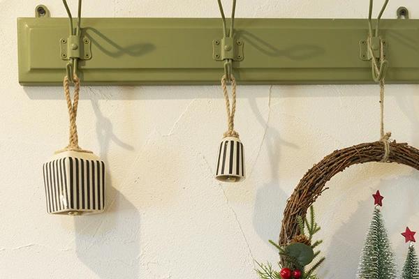 陶器で作られた可愛いベルです。ちょっとノスタルジックで、たとえば古民家カフェなんかに良く似合いそう。ナチュラルなテイストのお部屋や和室なんかにでもOKです。ちゃんと音も出せるんですよ。他にはない珍しいクリスマスオーナメントをどうぞ。