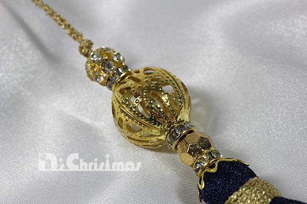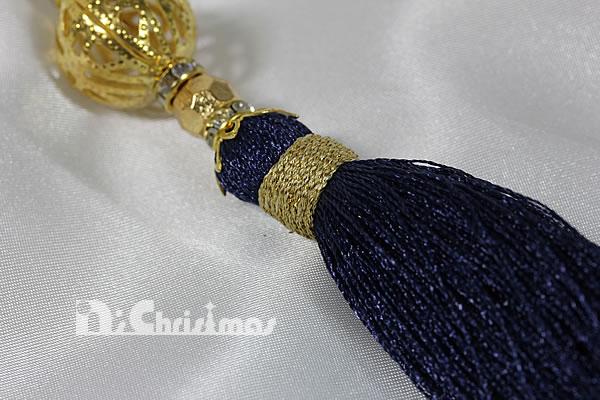 まるで王冠を連想するような金色の玉飾りにキラキラ輝く装飾を施し、金色の糸で房をまとめた、これぞオーナメントタッセルの王道といわんばかりのアイテムです。華やかなオーナメント達との相性抜群の基本形タッセルです。