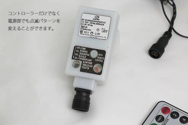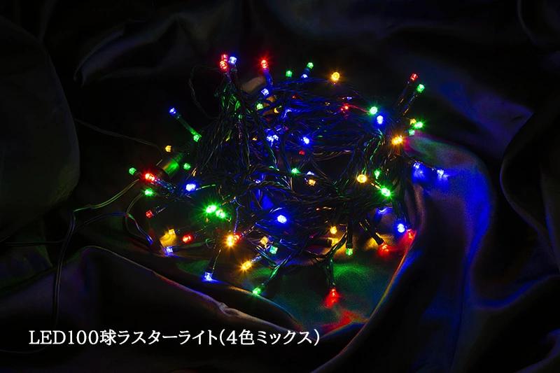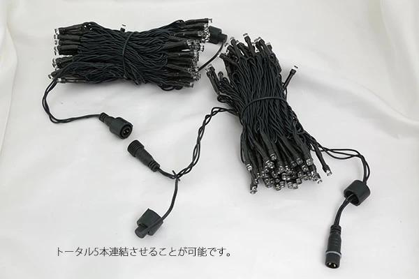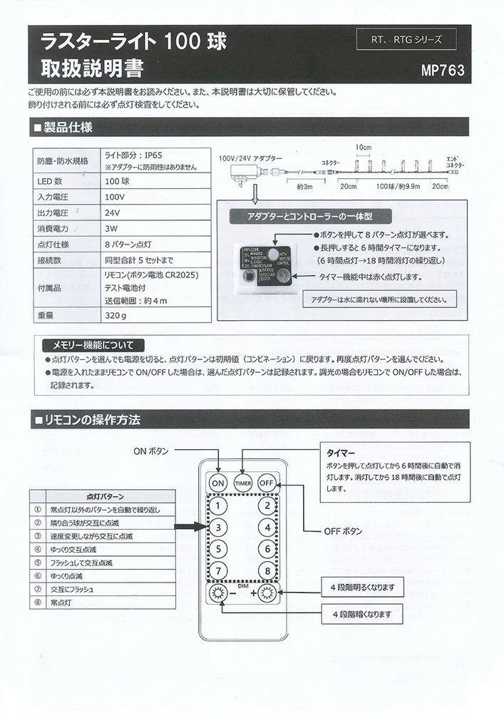 球数:100球(ミックスLED)全長:約9.9m(最初のライト~最後のライト)球間:約10cmコンセント(アダプター)から最初のライトまでの長さ:約3mコードの色:濃い緑連結可能セット数:最大5セットまで消費電力:約3W無線リモートコントローラー付(送信範囲:約5m)簡易コントローラー付24Vアダプター仕様屋外使用可