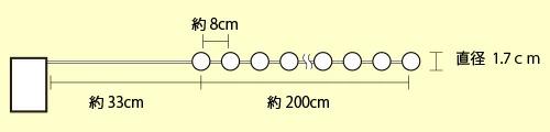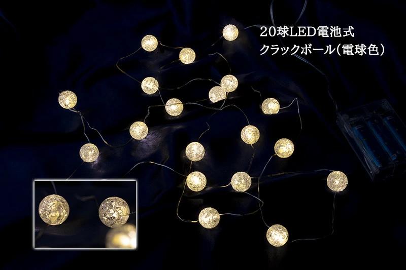 全長:約200cm(最初のライトから最後のライトまでの長さ)電源部分から最初のライトのまでの長さ:約33cm球数:LED20球(電球色クラックボール)球の直径:約1.7cm球間:約8cm常点灯単三電池3本使用(別売)室内仕様(雨や水がかからないようにお願いします。)