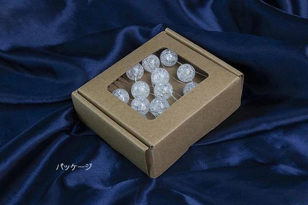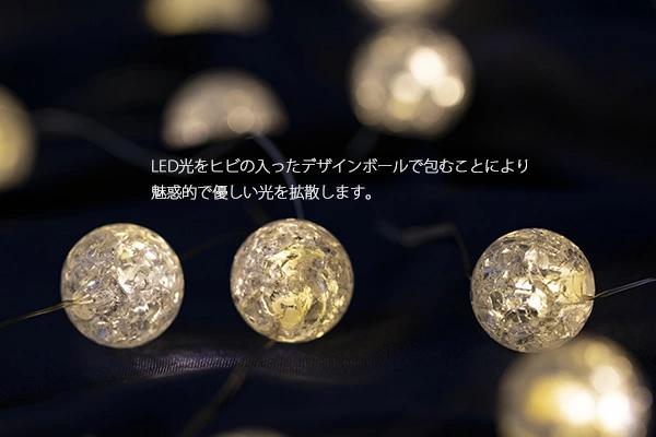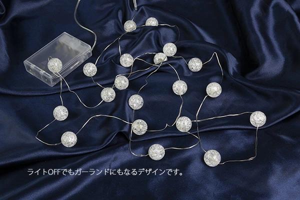 可愛くてオシャレなライトをご用意しました。LEDの光をヒビの入ったようなデザインのボールで包み込むことによって、魅惑的でやさしい光を拡散させます。飾り方ひとつでお部屋のインテリアとして素敵なライトとなります。また、ライトを消灯した状態でも、白ボールのガーランドにもなりえるデザインです。リーズナブルな価格ですので、ぜひ!