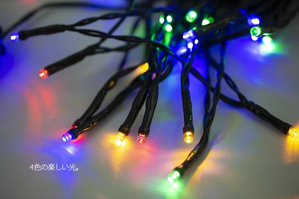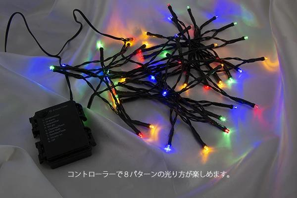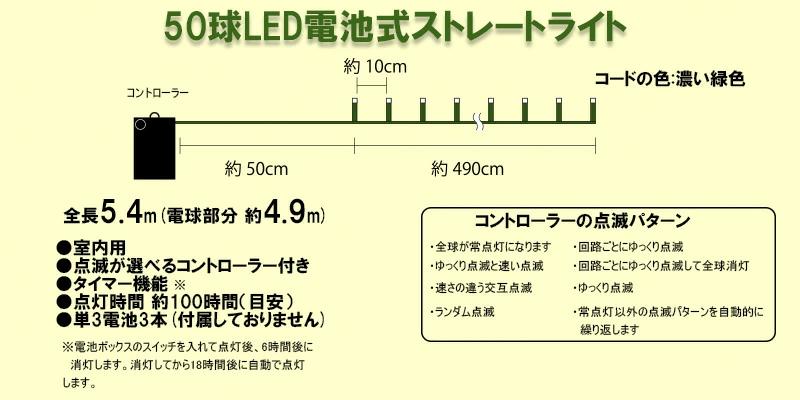 写真のイメージと実物とは色合いなど、多少異なることがあります。本製品は室内用です。雨や水がかからないように室内で飾ってください。LEDライトは予備球がありません。また構造上、球の交換もできませんので、あらかじめご了承願います。全長:約5.4m(ライト部分約4.9m)コントローラーから最初のライトまでの長さ:約50cm球間:約10cm球数:LED50球(4色ミックス)コードの色:濃い緑色8パターンコントローラー付(常点灯モード含む)自動タイマー付(点灯から6時間で消灯、18時間後再び点灯)単三電池3本使用(別売)室内用(雨や水がかからないようにお願いします。)