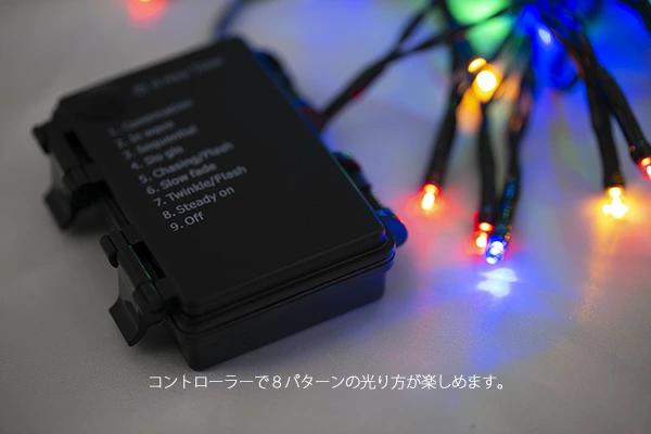 電池式のストレートライトなので配線の手間もなく、コントローラーで8パターン(常点灯含む)の光の変化が楽しめます。また、点灯から6時間で消灯、18時間後に再び点灯するタイマー機能が備わっています。