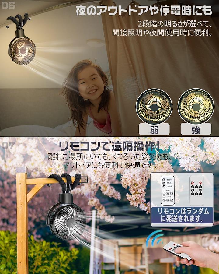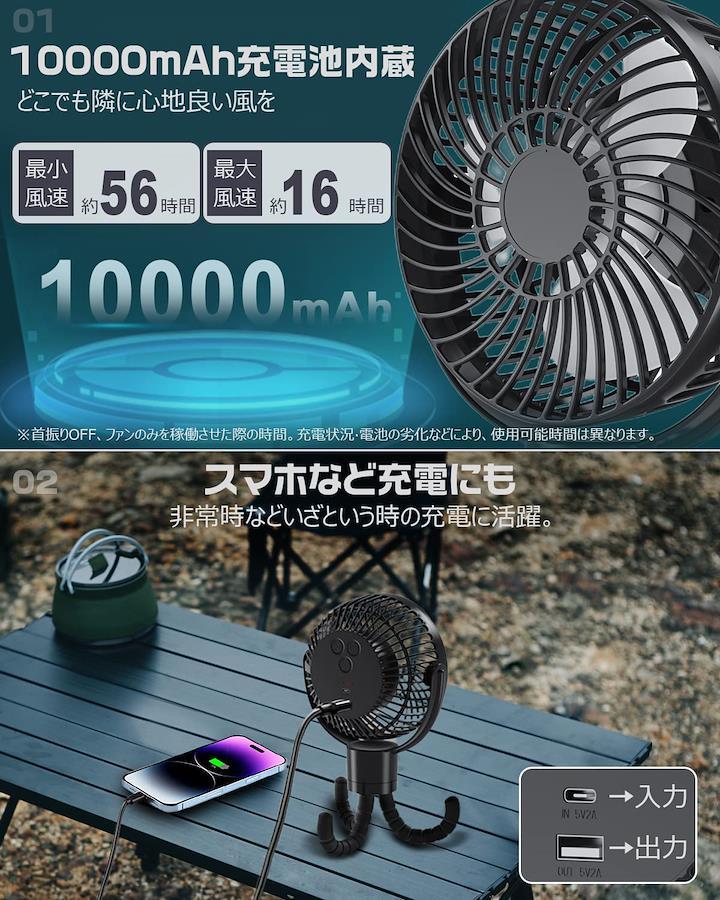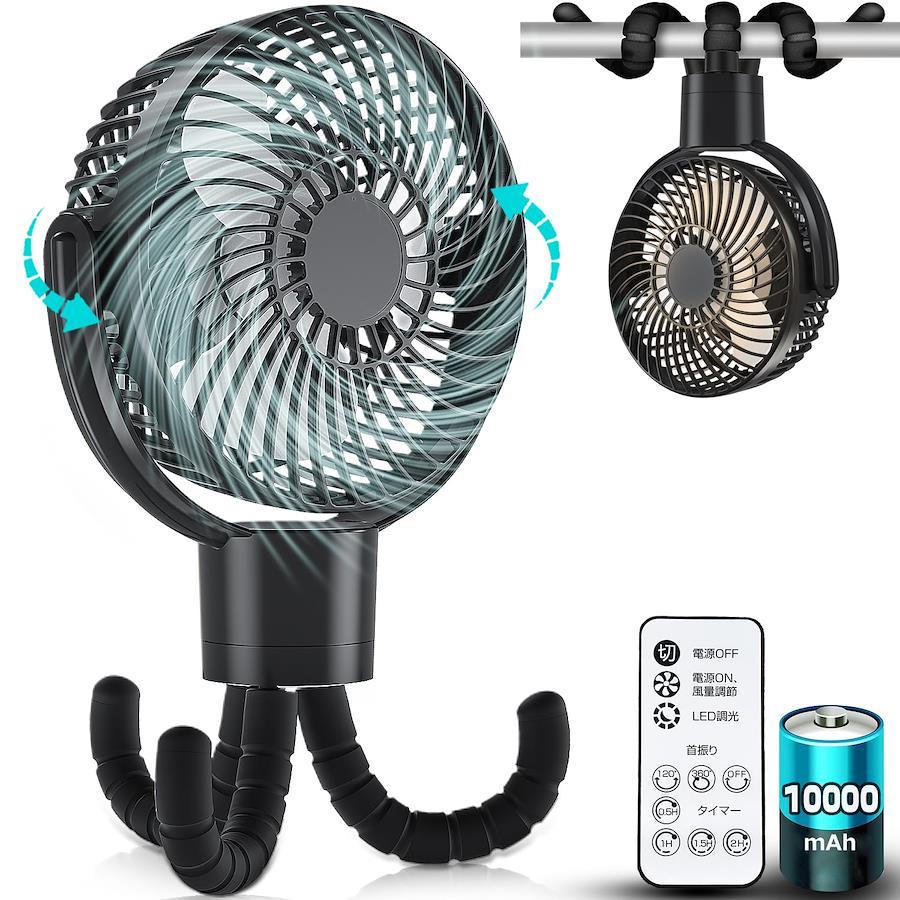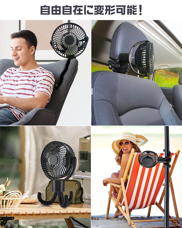3営業日以内に発送≪新品未開封品≫:【10000mAh充電池内蔵&どこでも涼しい】大容量10000mAhのリチウムイオンポリマー電池を内蔵しています。フル充電の場合、最小モードで約56時間の連続使用ができます。長時間の外出時も快適にお過ごしいただけます。変幻自在のフレキシブルアームで、使う場所にぴったりのカタチを作る3WAYポータブルファンです。「巻く」「吊るす」「置く」3つの使い方ができ、屋内外問わず様々なシーンで活躍いたします。【左右自動首振り&広範囲に風が送れる】AMZHOOZの小型扇風機は左右自動首振り角度を120°&360°を調節することが可能です。手動で上下角度調節もできて、広範囲に風を送ることが可能です。サーキュレーターとしても利用でき、お部屋に洗濯物を干す時にも活躍できます。さらに部屋の隅々まで空気を循環させられるため、効率のよい換気もできます。【風量3段階調節&リズム風搭載】風量は3段階の切り替えが可能で、お使いになる場所や暑さに合わせて、お好きな風を自由にお選びいただけます。また、一定の周期で[弱運転]と[切]を繰り返すリズム風を搭載し、自然の風のように快適です。【非常時に役立つLEDライト】夜