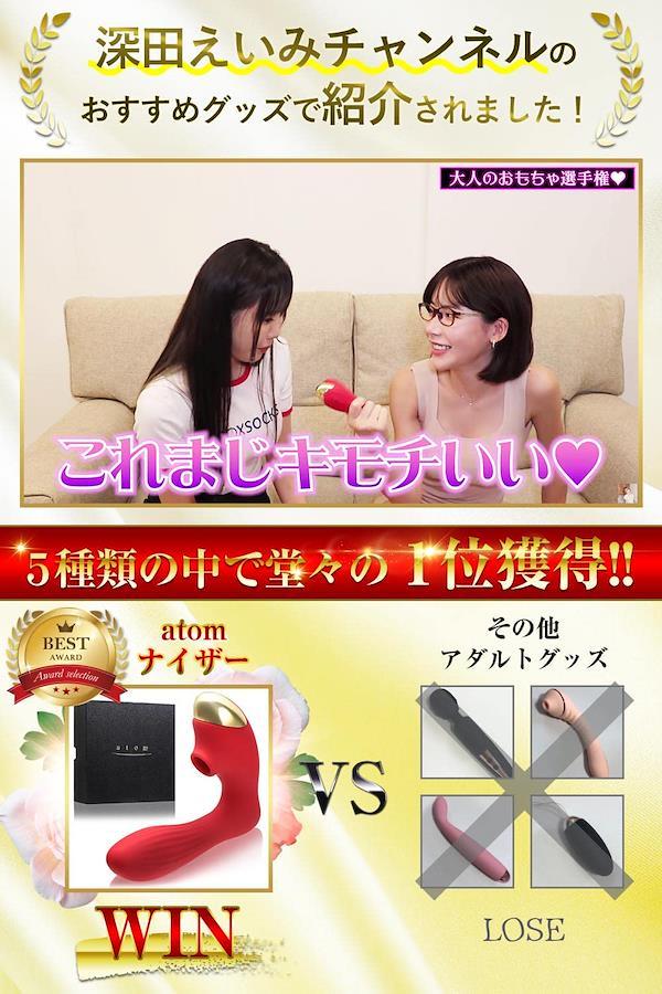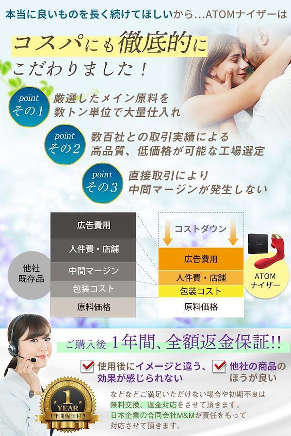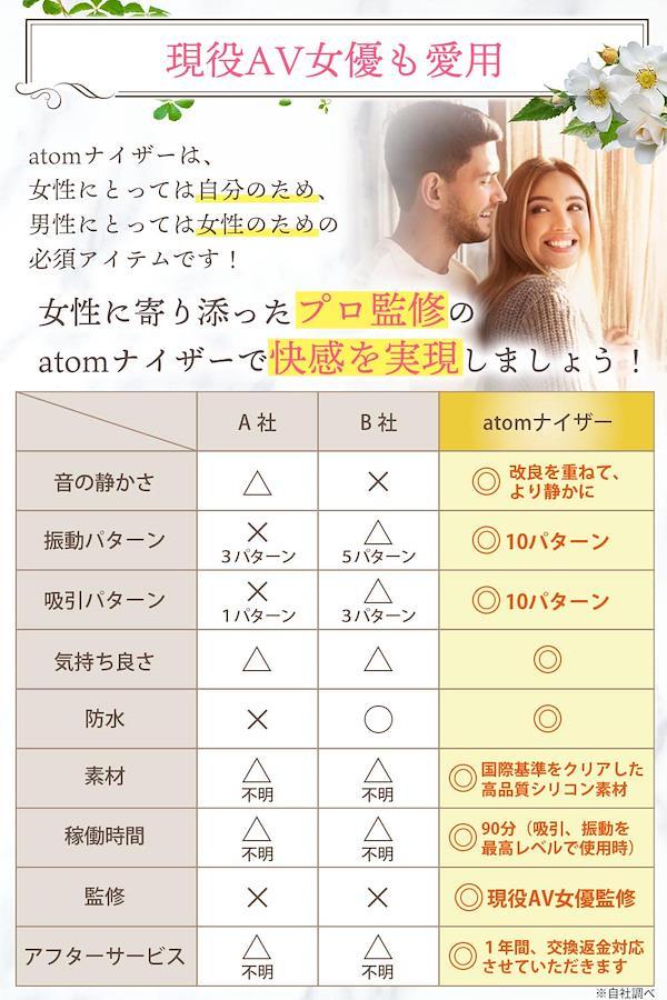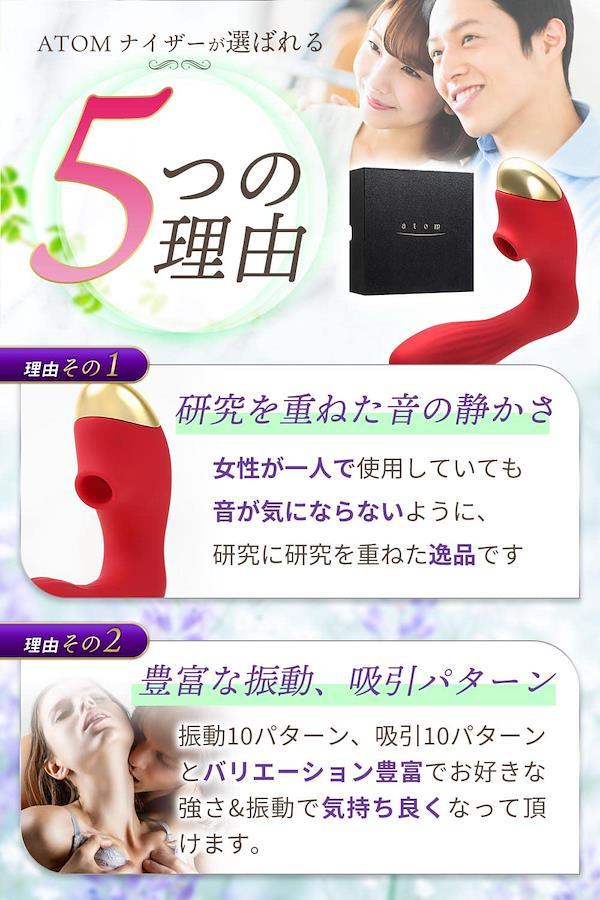 ?【現役AV女優も絶賛】atomナイザーは、女性は自分の為に、男性は女性のための必須の吸引バイブ(吸うバイブ)です。女性に寄り添った吸引バイブ(吸うやつ)でプロ監修のatom ナイザーで本当の快感を実現しましょう!現役AV女優の方に監修を頂き、試行錯誤の上、3年の研究を重ねて製品化した吸引バイブ(吸うバイブ)です。特に改良を重ねた点は女性用として、女性が部屋で一人で使いやすいような・静音(静音設計)、防水にこだわりました。更に静音(静音設計)なのにパワフルな振動にもこだわりました。おもちゃとして人気の電マやバイブやリモコンバイブと同等以上のパワフル振動です! ?3年もの月日を重ねて、女性のための女性用として振動、静音(静音設計)、パワフルにこだわった自信作です!他社様の人気商品(吸引バイブ、リモコンバイブ、 吸うバイブ、吸うやつ)も非常に人気ですが、atomナイザーでの本当に中いき(中いき開発)を体験してください!クリ(クリトリス)のみを吸引バイブで攻めるもよし!バイブと吸うやつでクリ(クリトリス)を同時に2か所をせめての協力な刺激で中いき(中いき開発)を体感してください。!ローターとしても使用可能で、複数ポインターとして優しく刺激を与えてください~ ?atomナイザーは1つでいろいろなおもちゃ(電マ、バイブ、リモコンバイブ)の機能を備えているため男性も部屋に備えて頂き、いざというシュチュエーションに備えてください~女性は男性の指で攻められるよりもおもちゃ(電マ、バイブ、リモコンバイブ)で優しく&パワフルに攻められることを望んでいます。すべてのおもちゃの機能を網羅したatomナイザーを部屋に準備して頂ければと思います。 ?静音(静音設計)、防水、パワフル、を兼ね備えた人気の吸引バイブ(吸うバイブ、吸うやつ)。コードレスでUSB充電なので初心者の方にも使いやすいアダルトグッズです。女子はアダルトグッズやおもちゃをひそかに購入しています。女子はそれぞれ好みの細い、太い、強力、刺激があります。男性との相性が合わない時もatomナイザーで一人エッチをして頂き、中いき(中いき開発)をしてください。オナニーは男性だけでなく、ほとんどの女性がやっています。その時に使用されている人気な電マなどの機能(吸うバイブ、吸うやつ、吸引バイブ、複数ポインター)をかねそなえたatomナイザーです。 ?女性のための女性用としての正規のアダルトのおもちゃが欲しい!という女性の声も非常に多いです!atomナイザーはわかりやすい説明書付きで初心者の方に使って頂きたいアダルトグッズです。いろいろなおもちゃ(ピストン、遠隔など)もありますが、atomナイザーをモニターとして使用して頂き、アンケートを取った結果、ほとんどの人が大満足でした!国際認証基準をクリアした高品質シリコン素材を採用!水洗いOKなので衛生面も◎となっております。モーターも研究に研究を重ねて静音&圧倒的な稼働時間90分(吸引、振動を最高レベルで使用時)を実現しました。女性が一人で使用していても音が気にならないように研究に研究を重ねた逸品です。振動10パターン、吸引10パターンとバリエーション豊富でお好きな強さ&振動で気持ち良くなって頂けます。ローターとしても使用可能で、複数ポインターとしてもご利用頂けます。