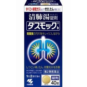 ■商品概要メーカー:小林製薬商品名:ダスモックb 40錠医薬品分類:第2類医薬品区分:OTC医薬品小児用区分:大人用(大人(15歳以上)の用量・用法しかない)薬剤形状:錠剤・丸剤・カプセル内容量:40錠商品概要:●タバコなどで汚れた気管支をキレイにして、咳や気管支炎を治し、呼吸を楽にする漢方薬【使用期限】出荷時点で使用期限終了まで1年以上JANコード:4987072047316商品コード:075651693■初回添付文書作成年月および改訂年月、添付文書版番号初回作成:2017/08改訂:―服用に際して、この添付文書を必ずお読みくださいまた必要なときに読めるよう大切に保管してください使用期限(パッケージ底面及びビンラベルに記載)を過ぎた製品は服用しないこと■特徴●タバコや排気ガスなどで、せき・たんが続く方のお薬です●漢方製剤「清肺湯(せいはいとう)」が気管支粘膜の汚れを取り除きながら、せき・たんをやわらげます●気管支の状態を正常に近づけ、呼吸をラクにしていきます■してはいけないこと(守らないと現在の症状が悪化したり、副作用が起こりやすくなる)■相談すること1.次の人は服用前に医師、薬剤師又は登録販売者に相談すること(1)医師の治療を受けている人(2)妊婦又は妊娠していると思われる人(3)胃腸の弱い人(4)今までに薬などにより発疹・発赤、かゆみ等を起こしたことがある人2.使用後、次の症状があらわれた場合は副作用の可能性があるので、直ちに服用を中止し、この文書を持って医師、薬剤師又は登録販売者に相談すること関係部位/ 症 状皮ふ /発疹・発赤、かゆみまれに下記の重篤な症状が起こることがあるその場合は直ちに医師の診療を受けること症状の名称/ 症 状間質性肺炎/階段を上がったり、少し無理をしたりすると息切れがする・息苦しくなる、空せき、発熱等がみられ、これらが急にあらわれたり、持続したりする肝機能障害/発熱、かゆみ、発疹、黄だん(皮ふや白目が黄色くなる)、褐色尿、全身のだるさ、食欲不振等があらわれる3.1ヶ月くらい服用しても症状がよくならない場合は服用を中止し、この文書を持って医師、薬剤師又は登録販売者に相談すること■効能・効果体力中等度で、せきが続き、たんが多くて切れにくいものの次の諸症:たんの多く出るせき、気管支炎■用法・用量次の量を食前又は食間に水又はお湯で服用してください年 齢 /1回量/服用回数大人(15才以上)/5 錠/1日2回15才未満 /×服用しないこと(1)定められた用法・用量を厳守すること(2)吸湿しやすいため、服用のつごキャップをしっかりしめること●食間とは「食事と食事の間」を意味し、食後約2~3時間のことをいいます■成分・分量1日量(10錠中)清肺湯エキス3.2g<原生薬換算量>オウゴン 1.0g キキョウ 1.0g ソウハクヒ 1.0gキョウニン 1.0g サンシシ 1.0g テンモンドウ 1.0gバイモ 1.0g チンピ 1.0g タイソウ 1.0gチクジョ 1.0g ブクリョウ 1.5g トウキ 1.5gバクモンドウ 1.5g ゴミシ 0.25g ショウキョウ 0.25gカンゾウ 0.5gより抽出(添加物:デキストリンを含む)添加物として、二酸化ケイ素、クロスCMC-Na、無水ケイ酸、l-メントール、プロピレングリコール、ステアリン酸Mg、香料を含有する●本剤は天然物(生薬)を用いているため、錠剤の色が多少異なることがあります■保管及び取扱上の注意(1)直射日光の当たらない湿気の少ない涼しい所に密栓して保管すること(2)小児の手の届かないところに保管すること(3)他の容器に入れ替えないこと(誤用の原因になったり品質が変わる)(4)本剤をぬれた手で扱わないこと(5)ビンの中の詰め物は輸送時の破損防止用なので開封時に捨てること■問合せ先製品のお問合せは、お買い求めのお店又はお客様相談室にお願いいたします小林製薬株式会社 お客様相談室〒541-0045 大阪市中央区道修町4-4-100120-5884-01受付時間 9:00~17:00(土・日・祝日を除く)副作用被害救済制度 0120-149-931小林製薬ホームページhttp://www.kobayashi.co.jp/■包装別共通商品(JAN)コード49870720473164987072047323■メーカー名小林製薬■内容量40錠×1個■希望小売価格1650円■OTC医薬品分類第2類医薬品■毒物・劇薬区分毒薬劇薬以外■農薬・動物薬区分農薬・動物薬以外■剤形区分錠剤■小児用区分大人用(大人(15歳以上)の用量・用法しかない)■商品区分OTC医薬品■免責事項【ご注意】・上記掲載の商品説明は、価格に関する情報を除きメーカーまたは、セルフメディケーション・データベースセンターから提供されたものです。・医薬品の使用にあたり、疑問・心配があるときは、必ず医師・薬剤師にご相談ください。・当サービスを介して購入等を行った医薬品の服用により生じた健康被害について、一切の責任を負わないものとします。