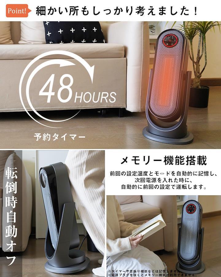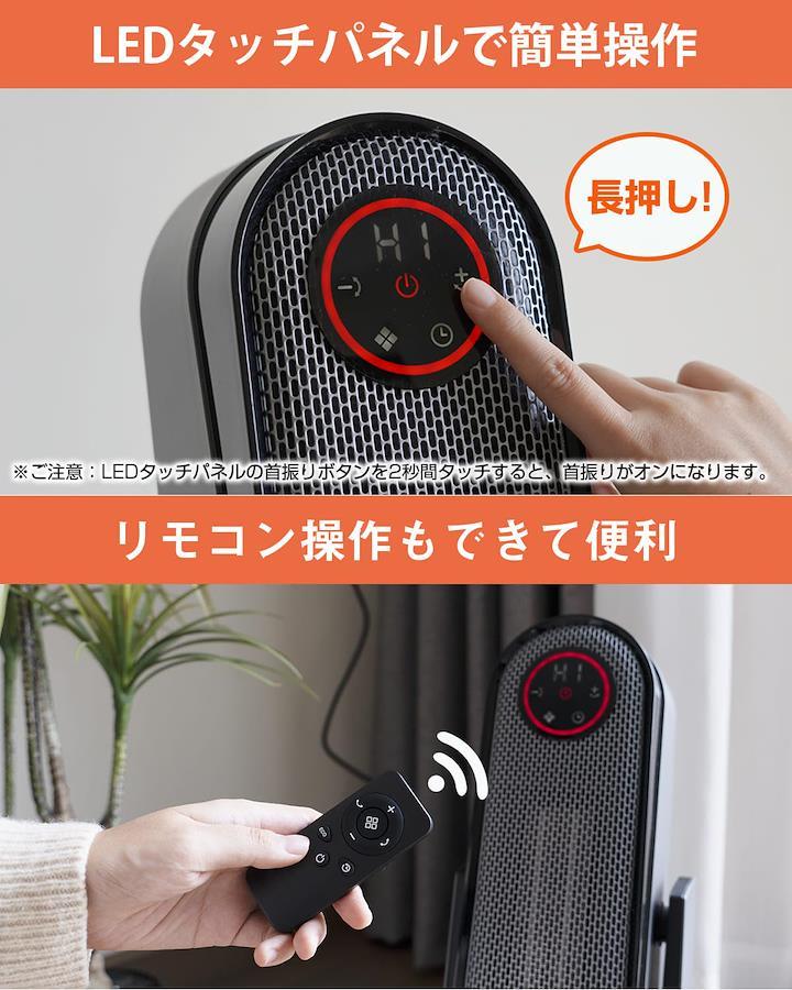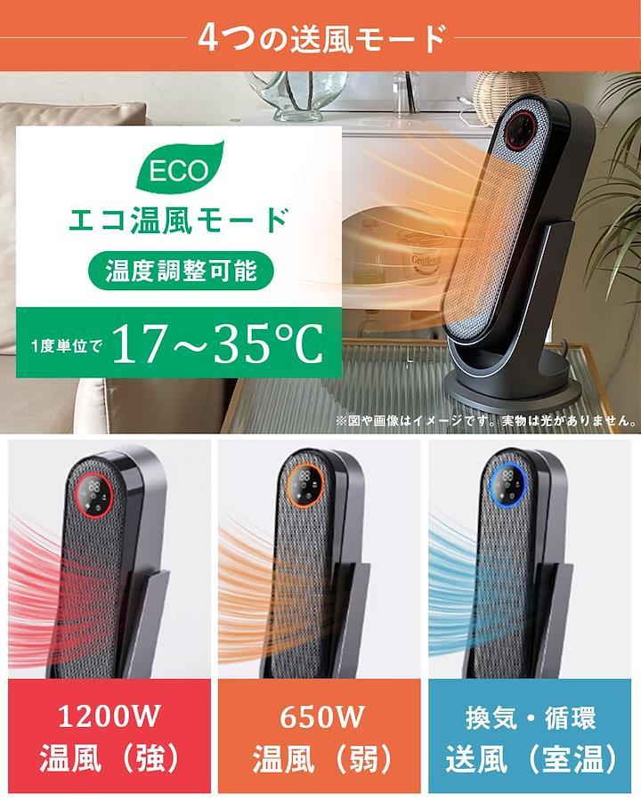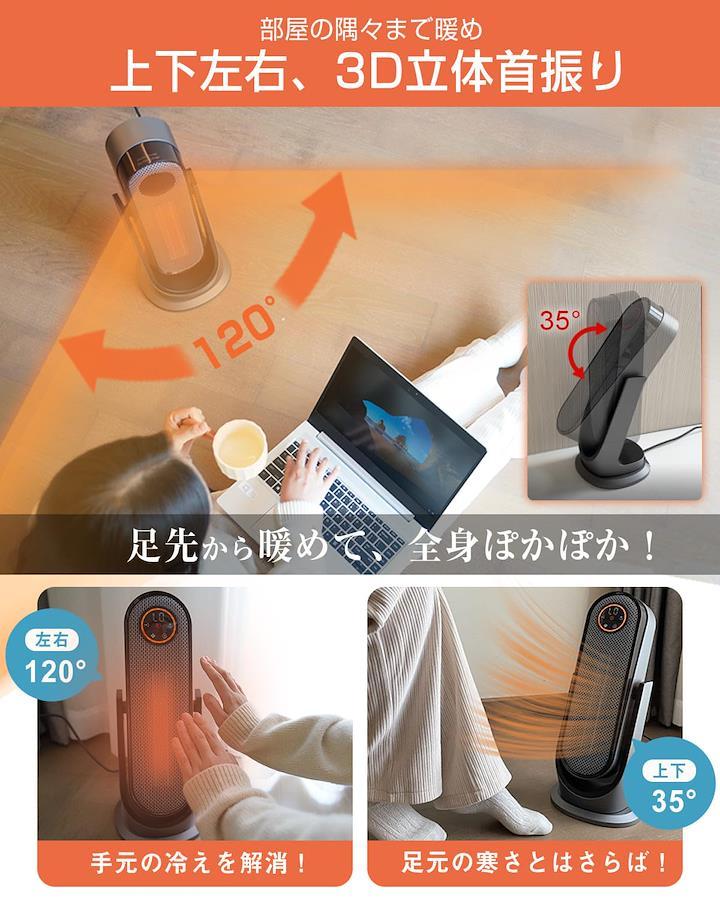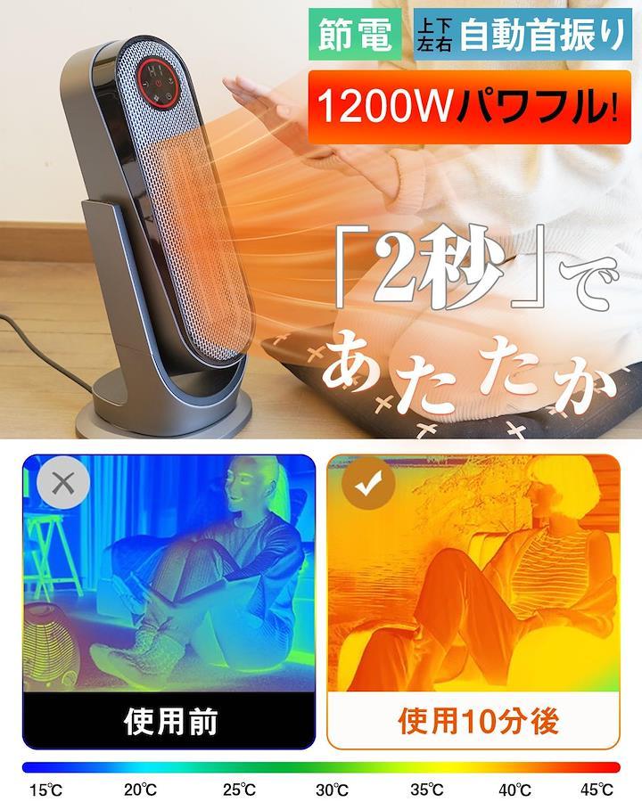 3営業日以内に発送≪新品未開封品≫:【2秒速暖・大風量・上下+左右自動首振り】 ●2秒だけで暖かい風が吹き出し、最大1200wのパワーで超強風立体送風、瞬時に全身ポカポカ暖かい。寒い冬を心地よく過ごしましょう!●セラミックヒーター 上下は35度自動首振り可能、頭から足元までしっかり速暖。左右合計120度の自動首振で本体を移動させずに広範囲をしっかり暖めてくれます。また同時に3D首振りが可能!可動範囲が広いので、暖かい空気が広がり、より広い場所へ送風するこが可能です。●天然ガスや石油などの燃料も使わないので有害ガスも出ず、換気も不要です。省エネだけでなく、環境にも優しいです。【4段階温度切り替え・LEDタッチパネル+リモコン2WAY操作】 ●高温風、低温風、ECO、送風の四つの温度モードが搭載され、ニーズによりお好みの温度を選択できます。●ECOモードを使用する時、17~35度の温度調節が可能です。温度に合わせ省エネ運転が実現できます。●遠距離でもリモコンを使ってセラミックヒーターを操作できます。モードを調整するとき、LEDディスプレイで一目で分かりやすいです。●高級大画面LEDタッチパネルが搭載しており、首振りや温度調