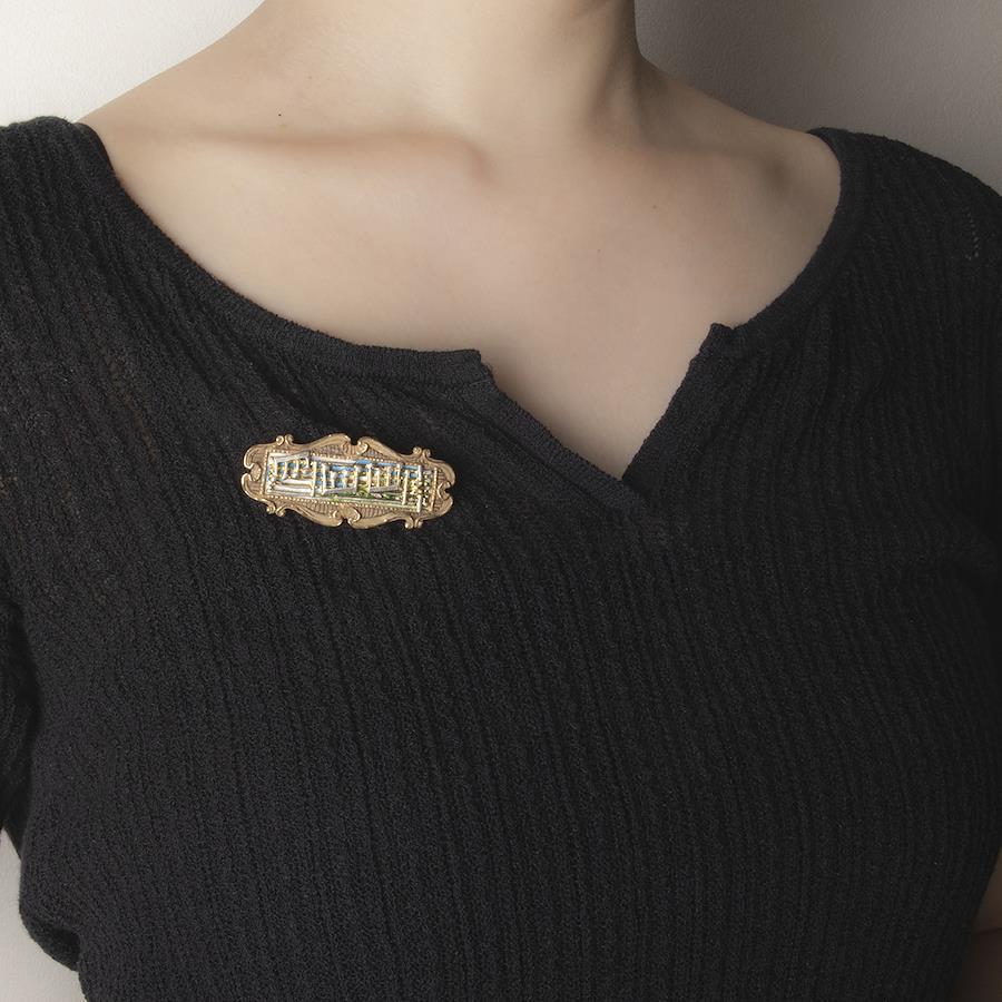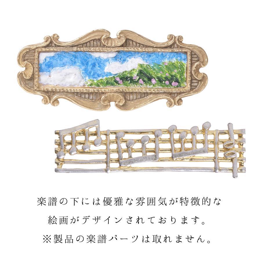 バッハの「フランス組曲 第5番 ト長調 BWV 816 ガヴォット」の楽譜をモチーフにしたブローチ。楽譜越しに覗く風景画には爽やかな青空とほのかに揺れる草木が描かれ、のどかで優雅な情景を窓から眺めているような印象を与えます。ハ音記号をモチーフにしたゴシック風の額縁に囲われ、芸術を感じるアイテムになっています。