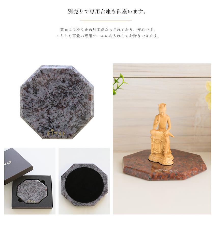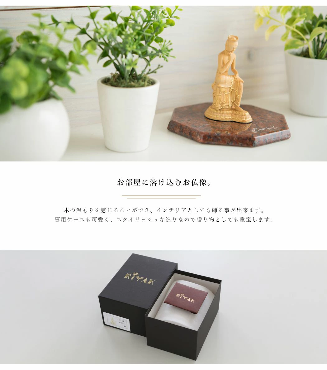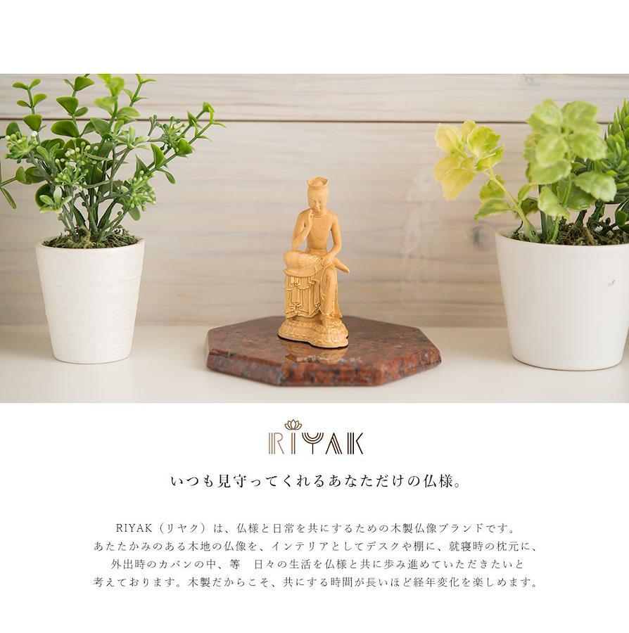 ─いつも見守ってくれるあなただけの仏様。─RIYAK(リヤク)は、仏様と日常を共にするための木製仏像ブランドです。あたたかみのある木地の仏像を、インテリアとしてデスクや棚に、就寝時の枕元に、外出時のカバンの中、等、日々の生活を仏様と共に歩み進めていただきたいと考えております。木製だからこそ、共にする時間が長いほど経年変化を楽しめます。商品名RIYAK 弥勒菩薩 BASICサイズ高さ:約7.2cm×幅:約3.7cm×奥行:約4.6cm材質柘植(つげ)備考■ベーシックシリーズギフトにも最適な手のひらサイズのベーシックシリーズ。机の上や、ちょっとした棚に。カバンの中にも入るので、持ち運びも手軽にできます。