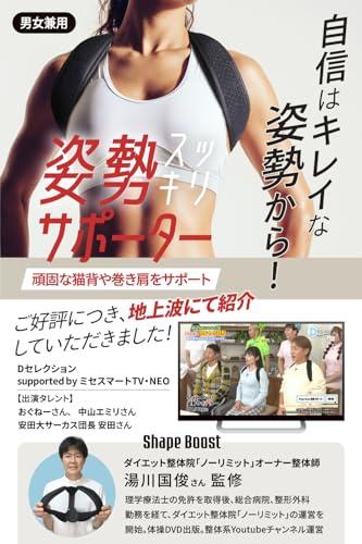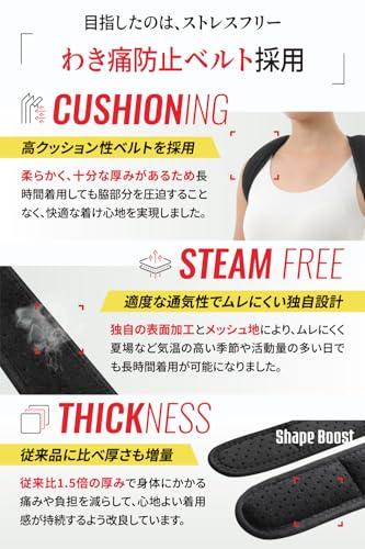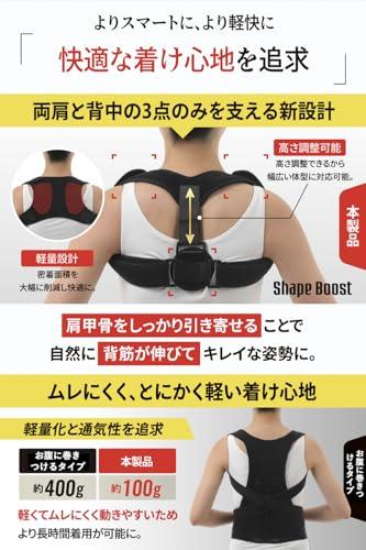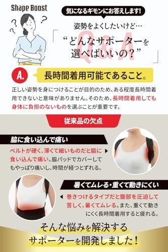 ①【正しい姿勢でカッコいいカラダを!】現代人はパソコンやスマホを使用する時間が長いせいでどうしても猫背、巻き肩など姿勢が乱れがち。自分で意識して姿勢を正してもいつの間にか戻ってしまい、なかなかキレイな姿勢を保つのは難しいものです。そこで整体院オーナーの湯川国俊さん監修のもと開発されたのがShape Boostの姿勢サポーターです。着用することで肩甲骨を引き寄せ、胸を張り、背筋を伸ばすことができ、正しい姿勢を身に付けられるようにサポートします。 ②【脇が痛くなりにくい高クッション性ベルト採用】従来の姿勢サポーターは着用時に脇が痛くなることが多く、そのせいで長時間着用することが難しいという問題点がありました。Shape Boostではその点を改善して十分な厚みがある高クッション性ベルトを採用。これにより快適な着け心地になり、無理なく継続しての着用が可能になりました。 ③【気軽にいつでもどこでも】Shape Boostの姿勢サポーターは、仕事しながら、スマホを触りながら、TVを見ながら、ゲームをしながら、家事をしながら・・と何かをしながら別途お時間をとらずに着用することができます。最初は10分-15分位から始めていただき、体が慣れてきたら少しずつ着用時間を延ばしてください。体型はそれぞれ異なりますので、実情に合わせて装着時間を調整してください。 ④【4サイズで幅広い方がご使用可能】みぞおち周りを採寸していただき、Sサイズ:約60cm?73cm、Mサイズ:約71cm?84cm、Lサイズ:約82cm?97cm、XLサイズ:約95cm?115cmの方が対象となります。※体型により若干の差異有り。ご自身のみぞおち周りのサイズがそれぞれのサイズの境目の場合は大きめをご購入されることをお勧め致します。商品到着より30日以内でしたらサイズ交換させていただきますので安心してお買い求めください。 ⑤【こんな方にオススメ】長時間のデスクワーク、スマホ操作、読書、ゲームをされる方におすすめです。長時間の同じ姿勢、間違った姿勢にならないように着用するだけでサポートします。正しい姿勢の習慣化で理想の美しい姿勢を身に付けましょう。 ⑥【安心の日本企業】商品の使い方でお困りの際や、初期不良の対応などは全て日本語で行なっております。よくある「問い合わせをしたけど返信がない」「返信はあったが日本語が通じない」等のトラブルはありませんので安心してお買い求めください。※お問い合わせ先は商品の取扱説明書に記載されております。 ⑦【30日間保証】商品に不具合等ありましたら、商品到着より30日間は返金対応などの保証を行なっております。何かお困りごとがございましたらお気軽にお問い合わせください。