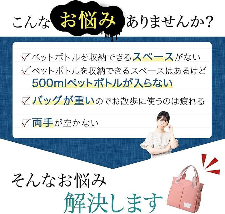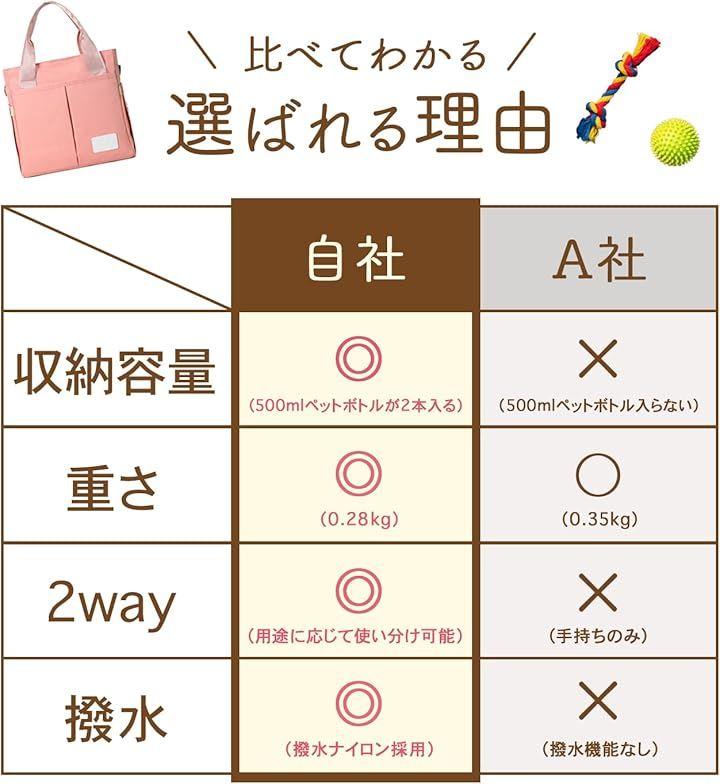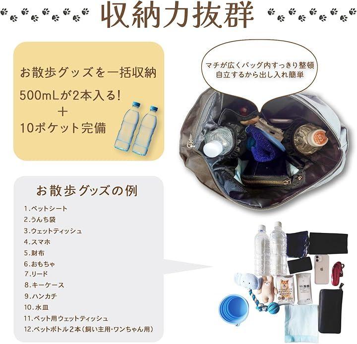 「ポケットたっぷり10カ所。整理整頓がラク」 うんち袋、ティッシュ、おやつ、マナーグッズ、スマホ…… 全部スッキリ収納できて、取り出しやすい ・メインポケット(ファスナー付き) ・内ポケット(ファスナー付きx1、オープンx2、ペットボトル専用x2) ・フロントポケット(テープ) ・背面ポケット(テープ) ・サイドポケットx2
