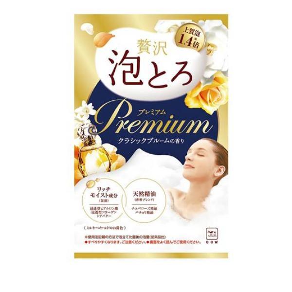 製品の特徴●牛乳石鹸共進社 お湯物語 贅沢泡とろ Premium(プレミアム)入浴料 クラシックブルームの香り●美容成分と保湿成分が贅沢に入った泡風呂入浴剤です。●泡立ち1.4倍(*1)!贅沢泡処方。モコモコ泡と、調香師と共同開発したこだわりの香りで、いつものお風呂を贅沢なリラックス空間に。[*1:160Lのお湯に本品を溶かし、シャワーで2分間泡立てたときの泡量(従来品比)]●リッチモイスト成分(*2) (浸透型ヒアルロン酸・コラーゲン・シアバター)と、天然精油(*3) (チュベローズ精油・パチョリ精油)配合。[*2:保湿成分][*3:香料ブレンド]●3つの無添加(パラベン・鉱物油・シリコーン)●ジャスミン・チュベローズ等のホワイトフローラルにアンバーが調和した、高級感あふれるクラシックブルームの香りです。●ミルキーゴールドのお湯色。●販売名:お湯物語 プレミアム 泡CB〈浴用化粧料〉
