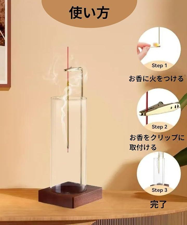 「煙や灰が飛び散らない清潔設計」 付属のガラス筒が香炉を覆うことで、煙や灰が周囲に飛び散るのを防ぎます。