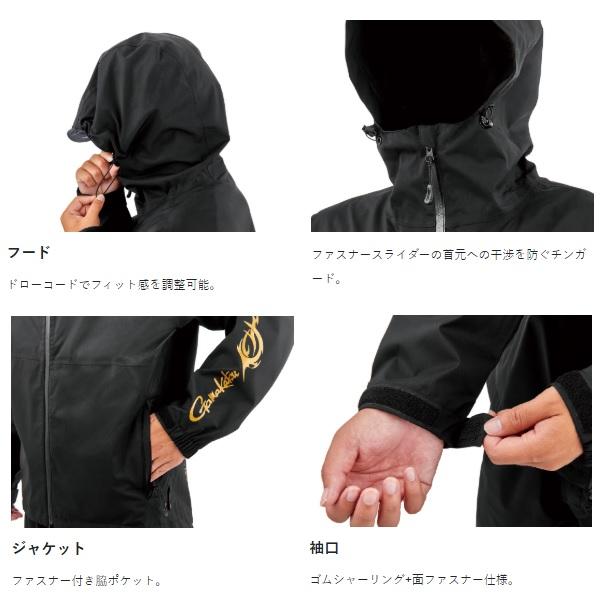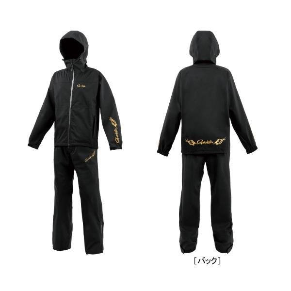スタンダードレインスーツ。耐水圧10000mm、透湿10000g/m2・24hのG-SPEC素材を使用したスタンダードなレインスーツ。●フードはドローコードを採用することで、キャップをかぶった状態でも頭部にジャストフィットできます。●ジャケットには大型ポケットを採用。●袖口はきっちりフィットできるゴムシャーリング+面ファスナー仕様。 サイズ:LL カラー:ブラック/ゴールド 素材:ポリエステル100% ※実物と色が違って見える場合があります。あらかじめご了承下さい。