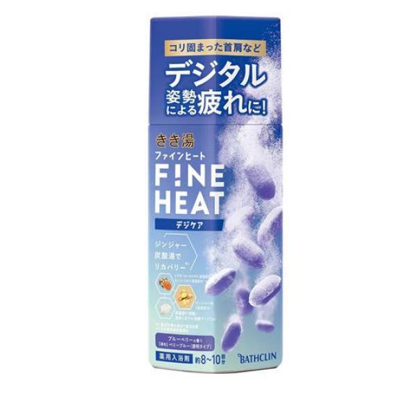 製品の特徴●バスクリン きき湯 FiNEHEAT ファインヒート デジケア●薬用入浴剤●コリ固まった首肩などデジタル姿勢による疲れに!ジンジャー炭酸湯が忙しい現代人の疲労感を効率リカバリー(*1)●高濃度炭酸(*2)、生薬(ジンジャー)、温泉ミネラルのツブが、すばやく発泡、効率的に温浴効果を高め血行を促進、疲労感をリカバリーします。●「計量タイプ」浴槽の湯量にあわせて使用量を調節できます。●高濃度炭酸(*2)+生薬(ジンジャー)+温泉ミネラル(硫酸ナトリウム)+トウキンセンカ・カッコンエキス(保湿成分)配合●香り:ブルーベリーの香り●お湯の色:ベリーブルー(透明タイプ)●医薬部外品●販売名:きき湯FHデジケアA-a
