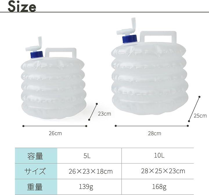 「収納時のサイズ」折りたたむと、5L(1個)は、約260x230x50mm、10L(1個)は、約280x250x50mmと小さく、バックパックや車のトランクにすっきり収まります。