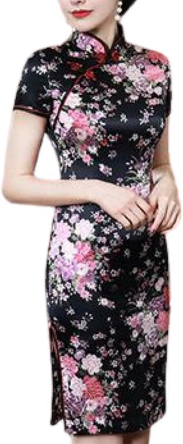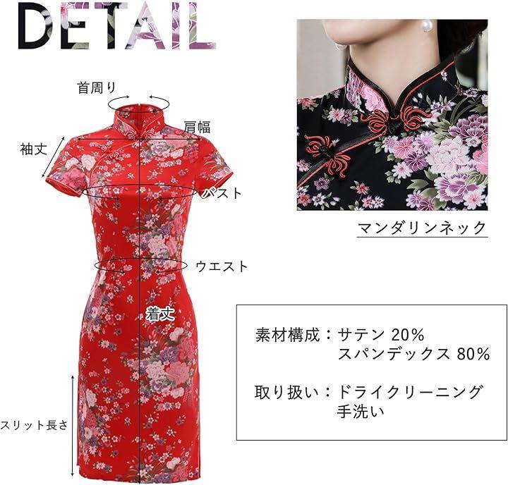 「魅力的なデザイン」このミニ丈のチャイナドレスのワンピースは、優雅な花柄と大胆なスリット(左右脇23~25cm)が特徴です。