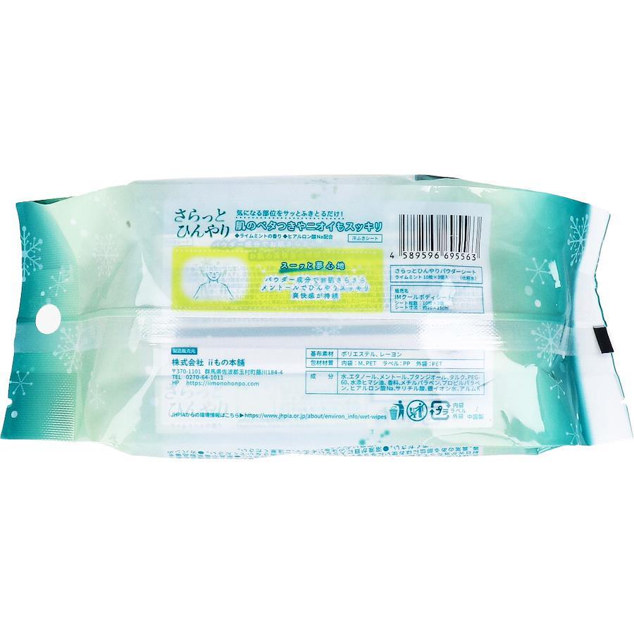 気になる部位をサッとふきとるだけ!肌のベタつきやニオイもスッキリ。●パウダー成分でお肌さらさら。●メントールでひんやりスッキリ爽快感が持続。●ライムミントの香り。●ヒアルロン酸Na配合。●お出かけの時に・スポーツの後に。