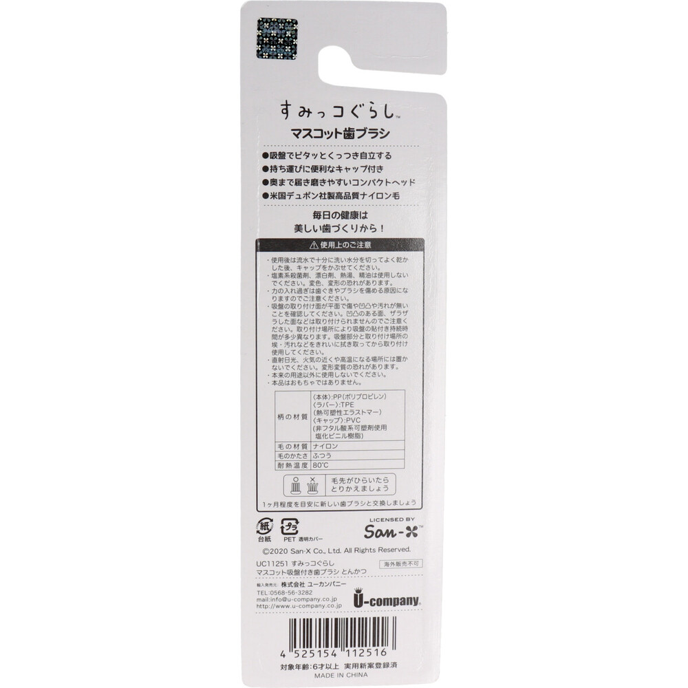 くっついて倒れない、吸盤付きで自立し衛生的でかわいいすみっコぐらしの歯ブラシです。●トラベルや携帯にも便利!清潔にブラシを保護するキャップ付き。●奥歯までキチンと届いて磨きやすいコンパクトヘッド。●高品質ナイロン毛使用。●マスコットキャップは部屋に飾ってもカワイイよ♪