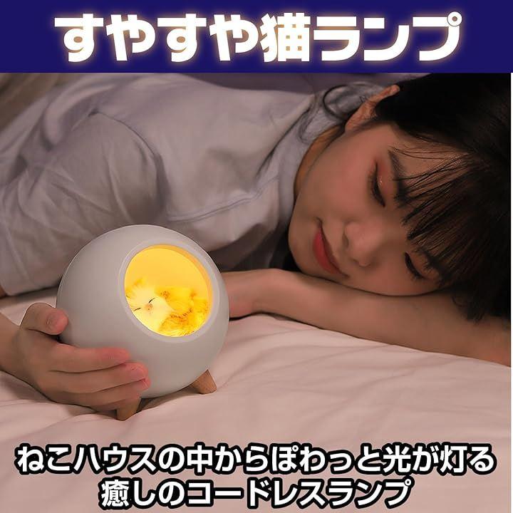 「すやすや眠る猫が癒しの存在感を放つデザイン」 まんまるのおうちの中で猫ちゃんがすやすや眠る姿をそのままインテリアライトにしました。