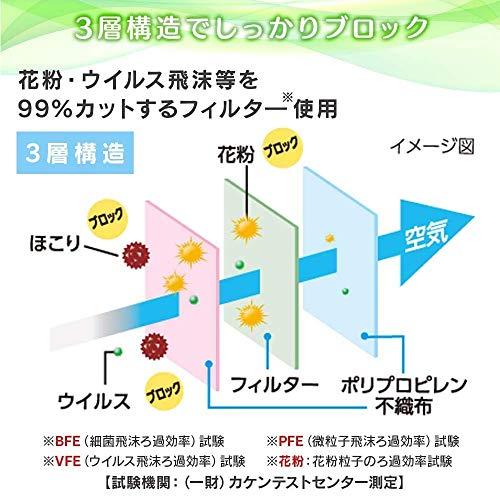 ■側面両端Vカット加工 ほほとのすき間を低減し長時間ぴったりフィット。 さらに花粉等の侵入をブロック!■耳にやさしい やわらか丸耳ゴムで長時間使用しても痛くなりにくい。■ダブルΩプリーツ加工 口元空間をキープするから、会話がラク。●商品サイズ(cm) 幅約17.5×高さ約9●枚数 100枚