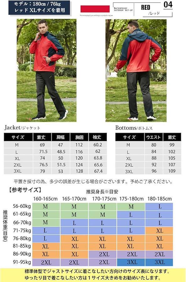「利用シーン」登山、釣り、バイク、アウトドア、キャンプ、サイクリング、スポーツ、防災など 「機能」*ジャケット:撥水加工(耐水圧7,000mm)、防風、防寒 *速乾トレッキングパンツ:撥水加工(耐水圧2,000mm)、防風、速乾、伸縮 「カラー」ブラック、ブラウン、ブルー、ネイビー、グリーン、レッド 「重量」ジャケット約660g、パンツ約350g 「メイン素材」ポリエステル 「サイズ」M~3XL <ジャケット> 着丈 /肩幅/胸囲 /袖丈 [M] : 69 / 47 / 112 / 60.2 [L] : 71.5 / 48.5/ 116 / 62 [XL] :74 / 50 / 120 / 63.8 [2XL] :76.5 / 51.5 / 124 / 65.6 [3XL] :795 / 53 / 128 / 67.4 <パンツ> ウエスト /着丈 [M] : 80 / 99 [L] : 84 / 102 [XL] :88 / 105 [2XL] :92 / 107 [3XL] :96 / 109