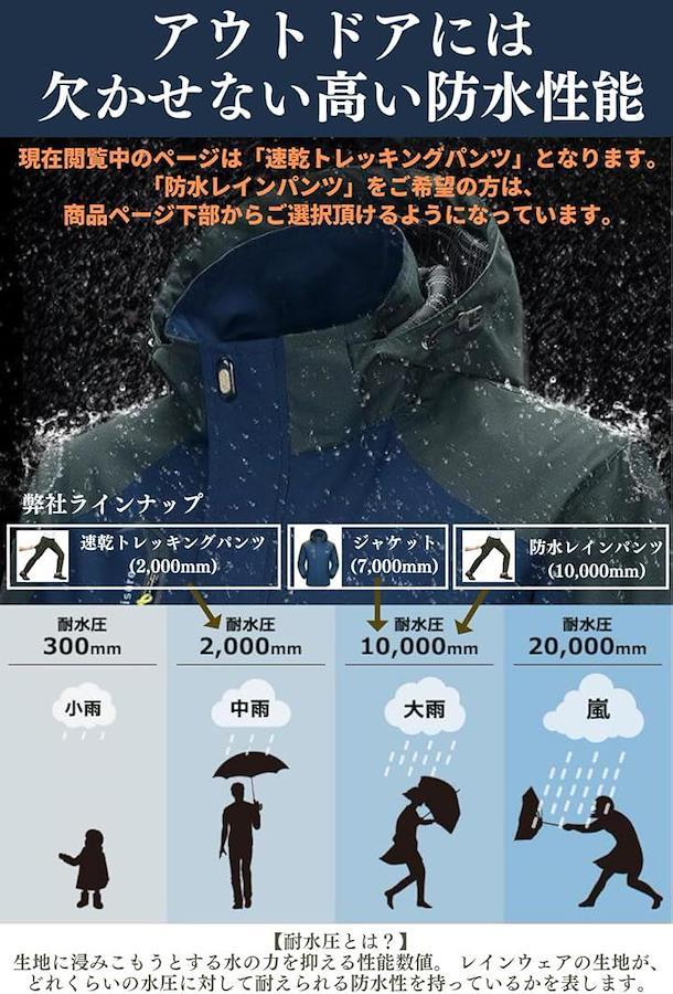 「選べる2種類のズボン」用途に応じた最適なズボンを2種類ご用意しました。 速乾性や履き心地を優先される方は「速乾トレッキングパンツ」を、防水性能を優先される方は「防水レインパンツ」をご選択ください。