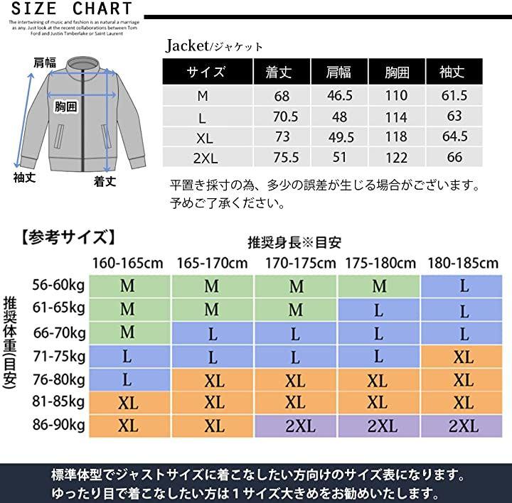* *カラー:ブラック、ネイビー、ブルー *サイズ:M,L,XL,2XL 「ジャケット」 着丈 /肩幅/胸囲 /袖丈 [M] : 68 / 46.5 / 110 / 61.5 [L] : 70.5 / 48/ 114 / 63 [XL] :73 / 49.5 / 118 / 64.5 [2XL] :75.5 / 51 / 122 / 66
