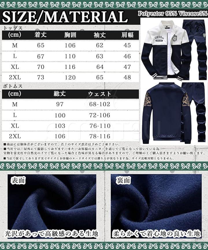 「サイズ」(上)着丈/胸囲/袖丈/肩幅 (下)総丈/ウエスト「M」上.65/106/62/45 下.97/68-102「L」上.67/110/63/46 下.100/72-106「XL」上.70/116/64/47 下.103/76-110「2XL」上.73/120/65/48 下.106/78-116 *サイズに若干の誤差が生じる場合がございますのでご了承ください。