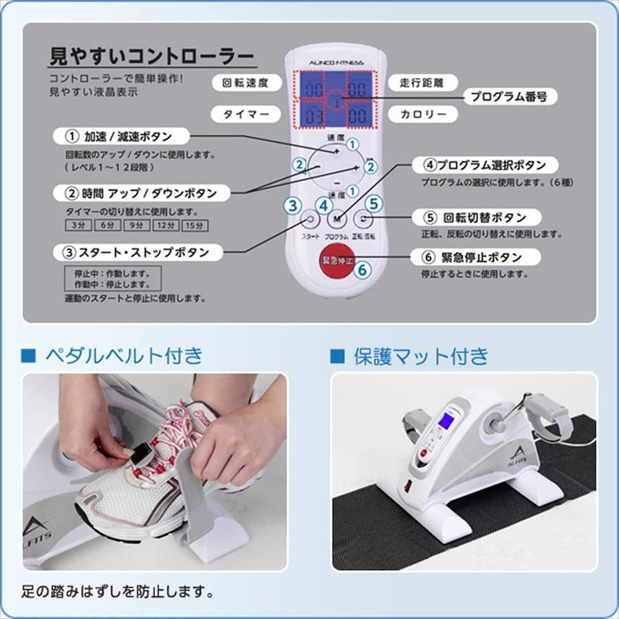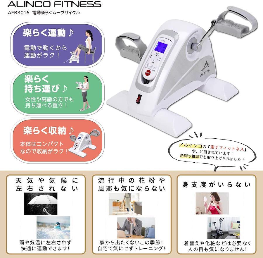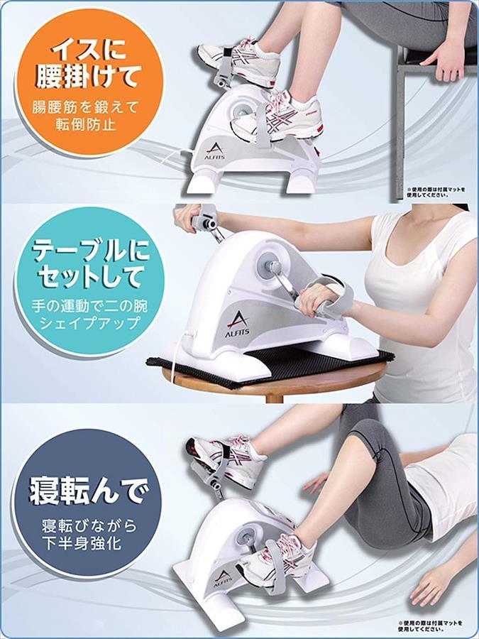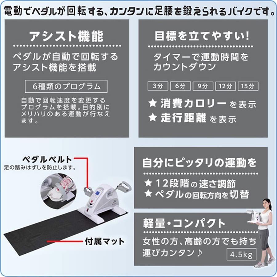 :●電動でペダルが回転するアシスト機能がついたコンパクトバイクです。●自宅のイスを使って手軽にバイク運動が出来るのが特徴です。●本体はペダルが自動で回転するアシスト機能を搭載しており、 電動で回転するので、運動に慣れていない方や高齢者の方でもゆっくりしたペースで運動できます。●運動に慣れてきたら徐々にスピードを上げて、体力アップも図れます。●テーブルの上に本体を置いてペダルを手で回せば腕のシェイプアップも可能で、イスに腰掛けて運動する以外にも横になった状態でバイク運動が出来ます。●速度は12段階で切り替えが可能です。●リモコンが付いているので操作も簡単に行え、LEDランプ搭載で大きく見やすい画面です。●コンパクトな本体は場所を選ばず、どこでも手軽に運動ができ、軽量なので女性の方でも移動がラクラク、使わない時は部屋の隅に保管できます。●ペダル部分には足の踏み外しを防止するペダルバンド付です。●床面の保護や運動時の本体のズレを防止するマットが付属します。●膝を持ち上げるバイク運動は腸腰筋を鍛え、転倒防止にも役立ちます。省スペースで手軽に有酸素運動ができるので運動の苦手な人