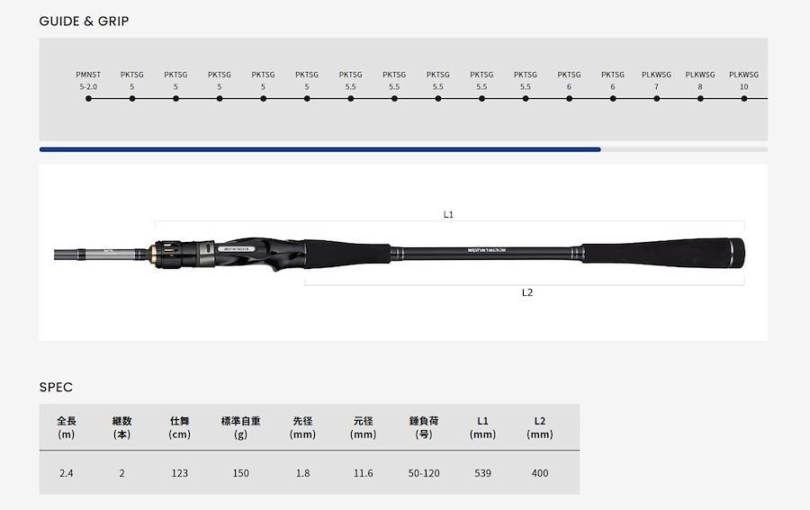 全長:2.4m継数:2本/仕舞:123cm自重:150g錘負荷:50-120号