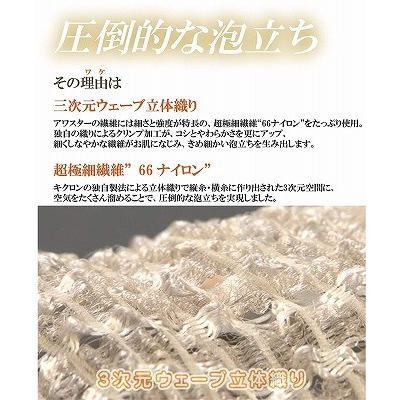 今までにないウェーブ立体織りのナイロンボディタオル♪驚きのたっぷりとした泡立ち、すすぎも簡単で乾きも早いです。●お肌に密着、独特シャリ感。パンティストッキングでおなじみ、超極細66ナイロン繊維を使用、やわらかいのに腰のあるシャリ感が満足です。●立体織り。「たっぷりクリーム泡る」。キクロンオリジナル、ウェーブ立体織り。こまやか繊維の突起ボリュームウェーブで泡立ちがいっそうUP、ぷくぷくクリーム泡です。●泡立ち2倍(メーカー比)こまやかな糸とオリジナル織りでたっぷりすぎるほどの泡立ち。ボディソープ・石けんどちらとも相性がよく、少ない量でも満足の洗いごこちです。