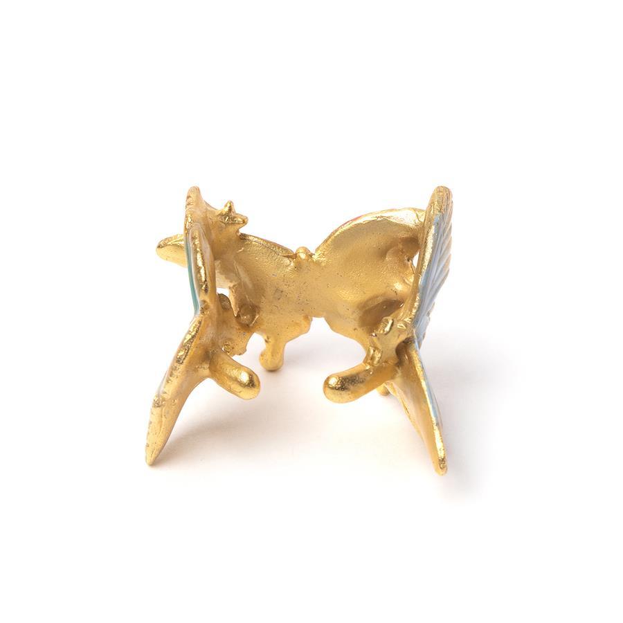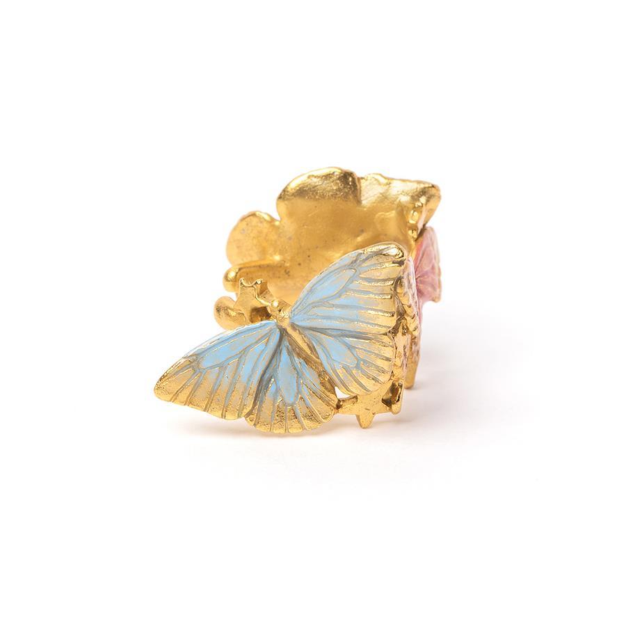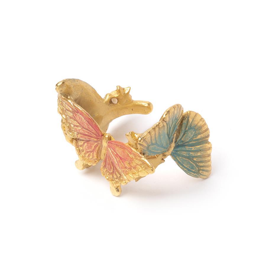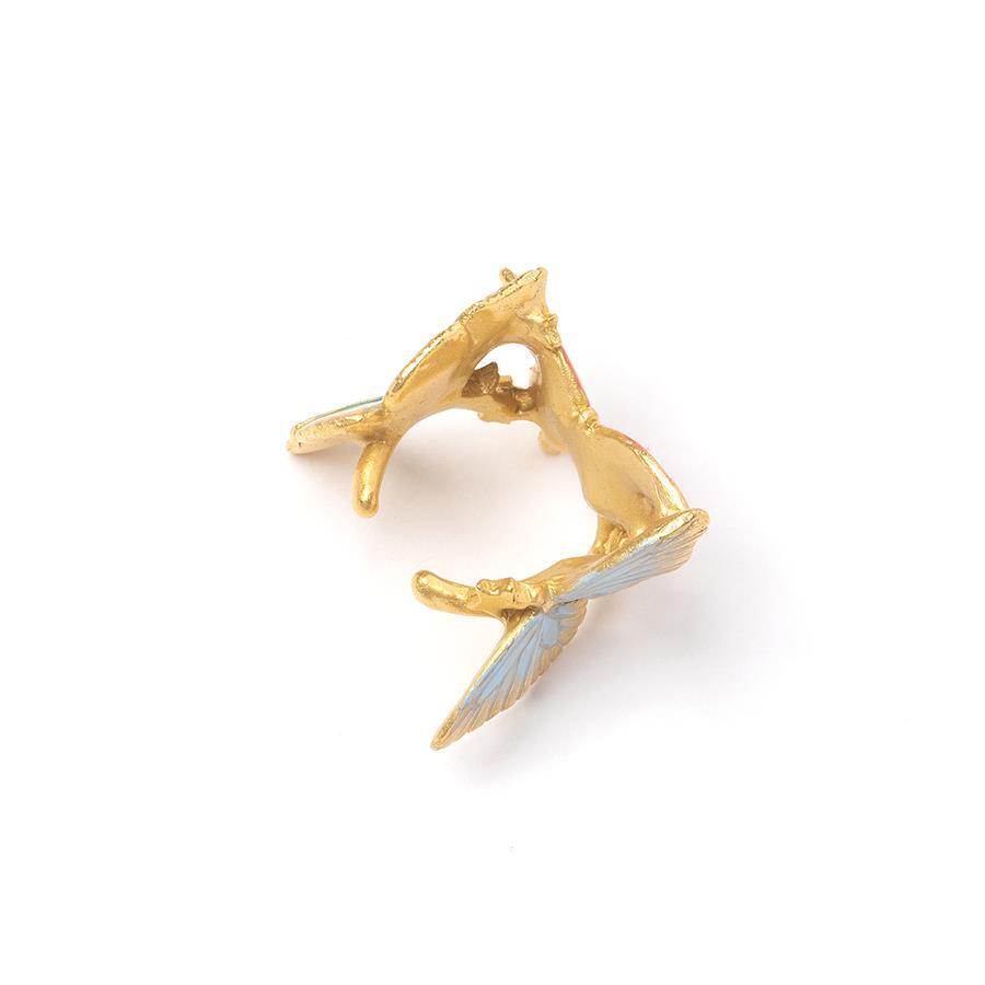 様々な種の蝶が飛び交う幻想的な光景をイメージしたイヤーカフ。まるで夢を見ているかのような淡く優しく美しいカラー。存在感のある大きめのモチーフでコーディネイトの主役にピッタリなアイテムです。多くの色が使われていますがトーンを合わせることで美しくまとまり、どんな色の服にも合わせやすく仕上げました。左右どちらの耳にでも合わせられるようにデザインされていますが、左耳への着用がおすすめです。【素材】真鍮 日本製【寸法】縦約17mm×横約22mm