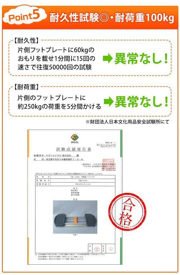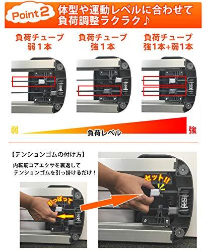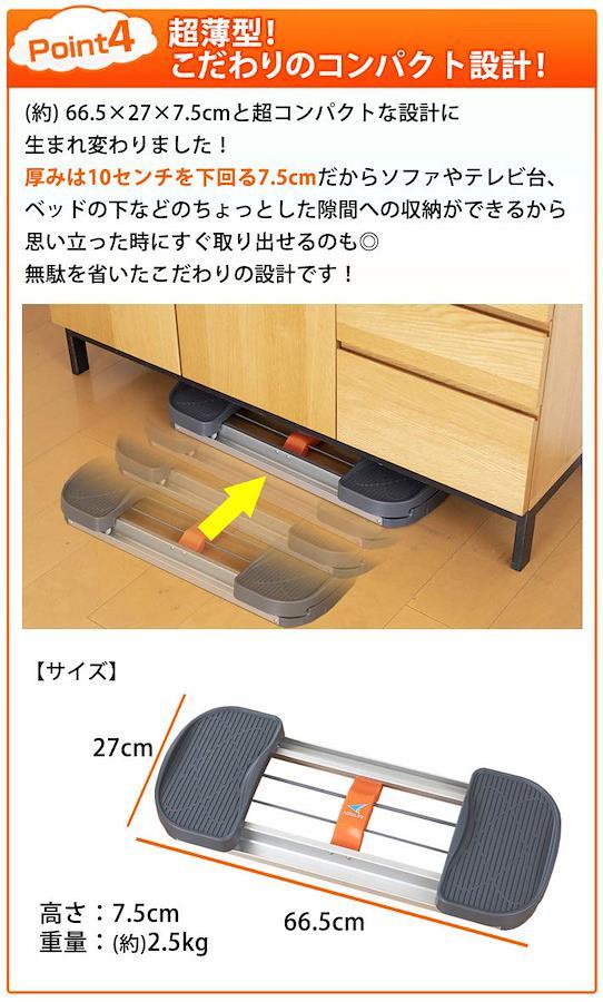 :【ハンドルなし!】 脚だけじゃないお腹・ヒップ・体幹も同時に!【体型や運動レベルに合わせて負荷調整】 負荷調整は3通り!レベルに合わせて調整できるから初心者でもOK!【改良された静音設計】 フレームにアルミを採用!騒音試験48db!【超薄型!こだわりのコンパクト設計!】 ソファやテレビ台、ベッドの下などのちょっとした隙間への収納が可能!【耐久性試験合格!耐荷重100kg】 耐久性→異常なし!耐荷重→異常なし!