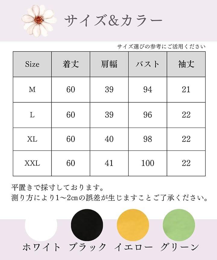 M:着丈60、肩幅39、袖丈21、バスト94 L:着丈60、肩幅39、袖丈22、バスト96 XL:着丈60、肩幅40、袖丈22、バスト98 XXL:着丈60、肩幅41、袖丈22、バスト100