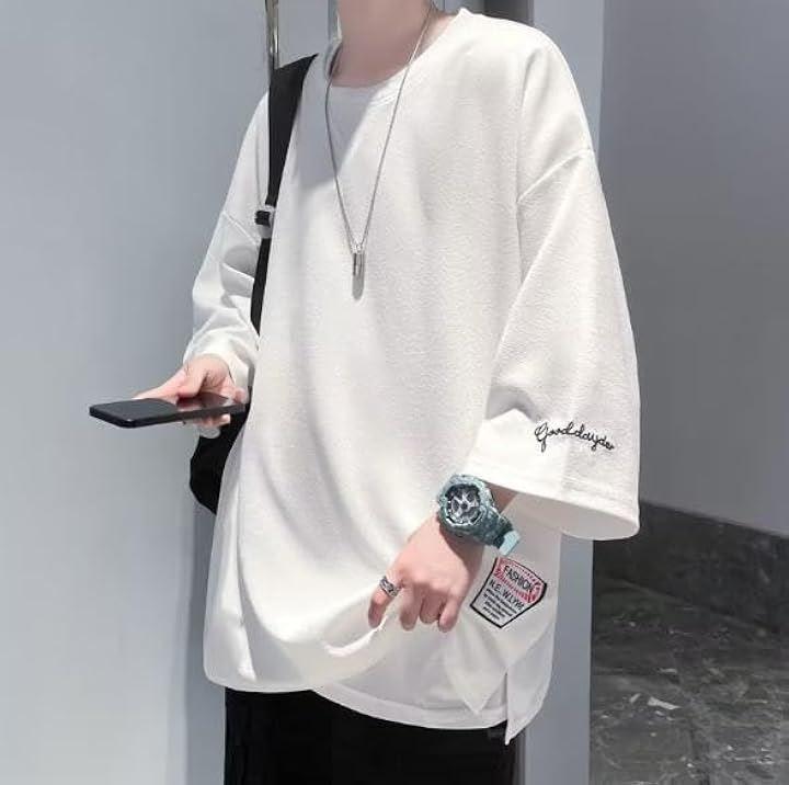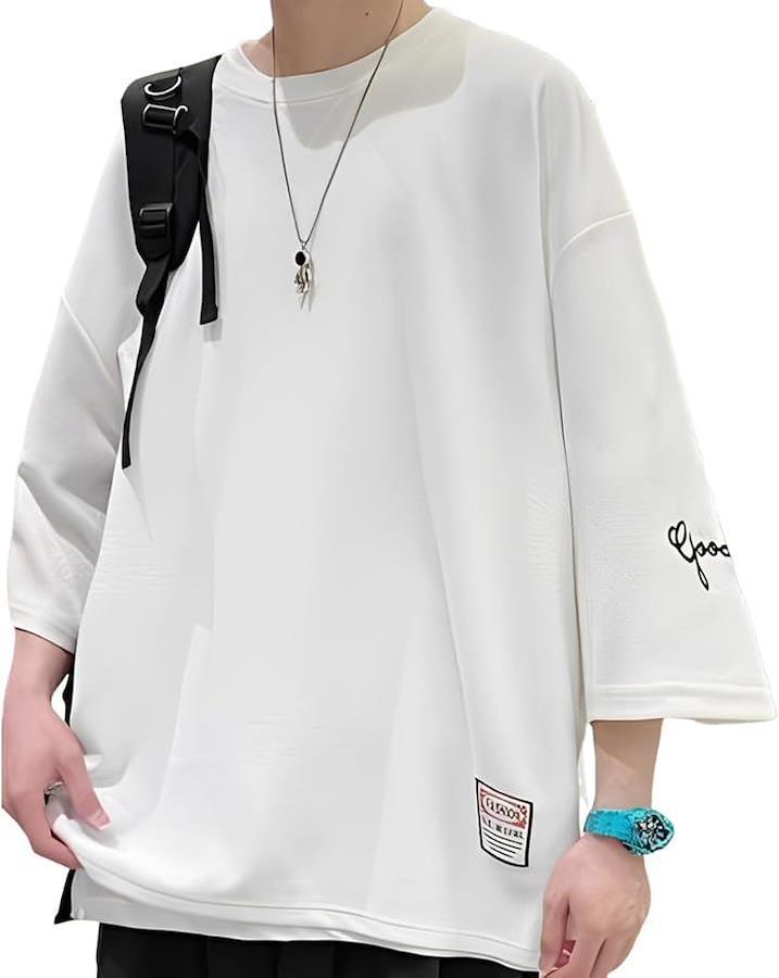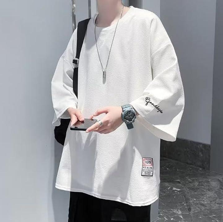 *ゆったりとしたシルエットで、幅の広い7分袖のクルーネックtシャツ