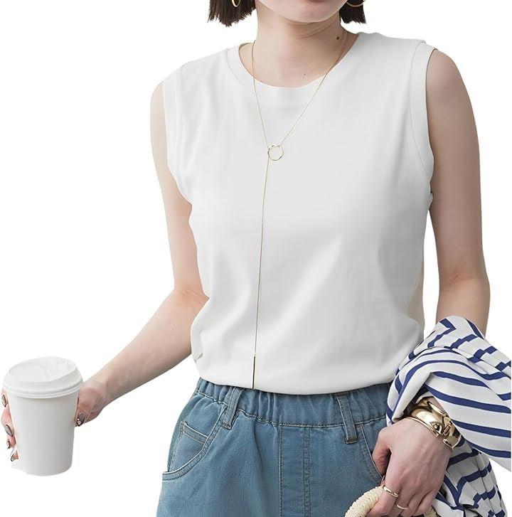 肌触りよい無地のノースリーブプルオーバーなので、きれいめシンプルなシャツは1枚で着ても、インナーでも使えてコーディネートにも便利なトップス。