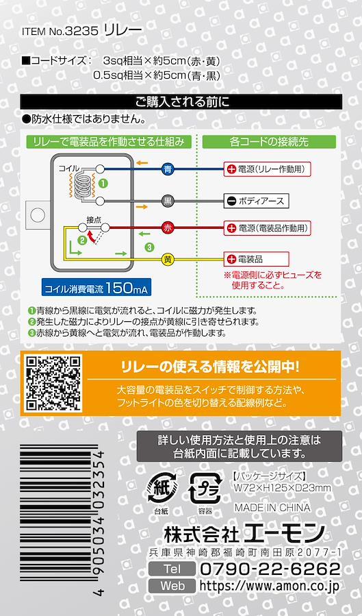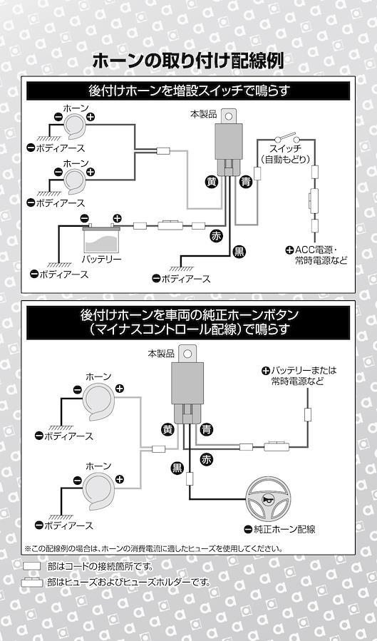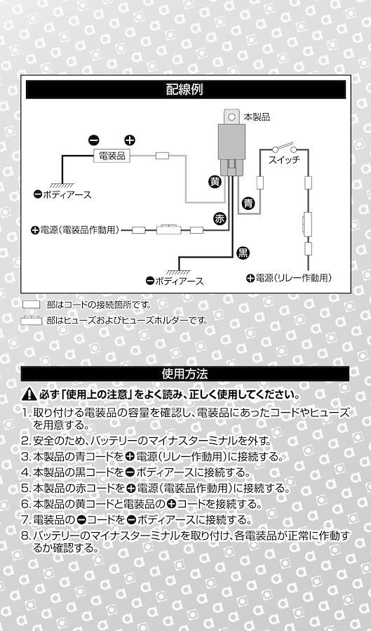 商品紹介■大容量(20Aまで)の電装品の配線をサポート■小さな電流で大きな電流を使う電装品を取り付けるときに使用上の注意製品の仕様は予告なく変更する場合がございます。