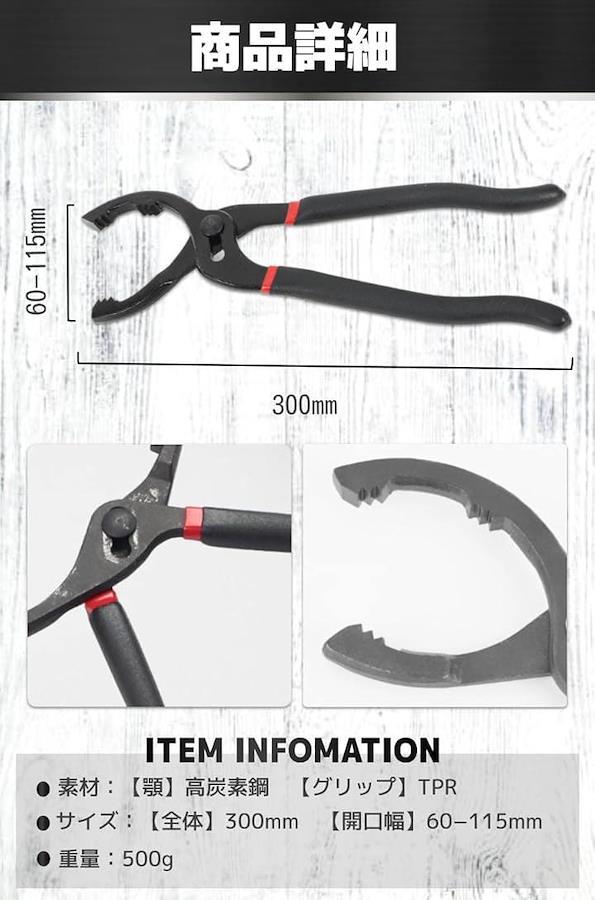 「商品詳細」 素材:「顎」高炭素鋼 「グリップ」TPR サイズ:「全体」300mm 「開口幅」60−115mm 重量:500g