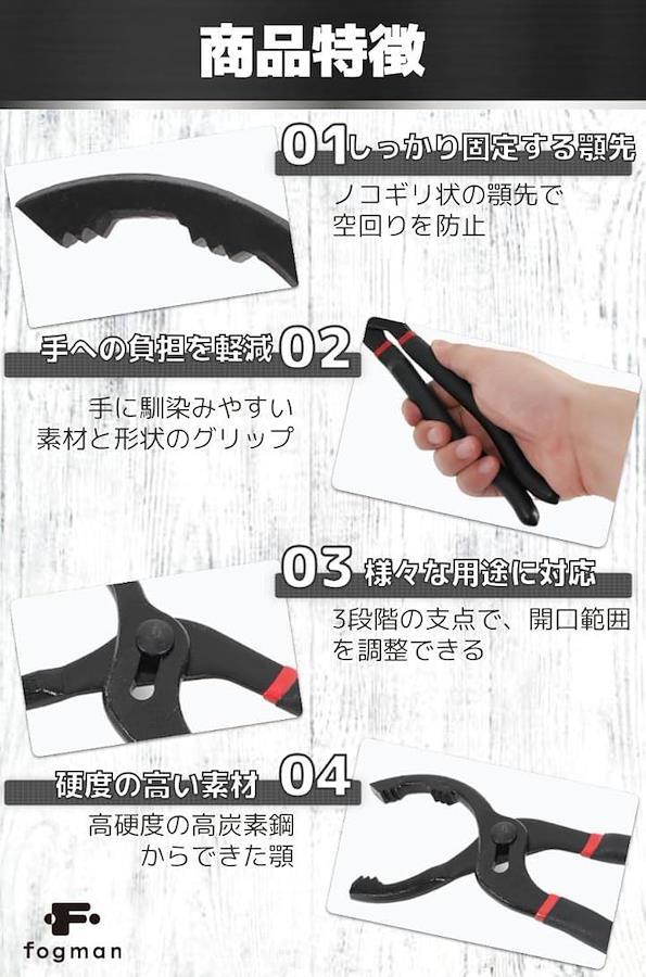 「商品特徴」 しっかり固定する顎先:ノコギリ状の顎先で空回りを防止 手への負担を軽減:手に馴染みやすい素材と形状のグリップ 様々な用途に対応:3段階の支点で、開口範囲を調整できる 硬度の高い素材:高硬度の高炭素鋼からできた顎