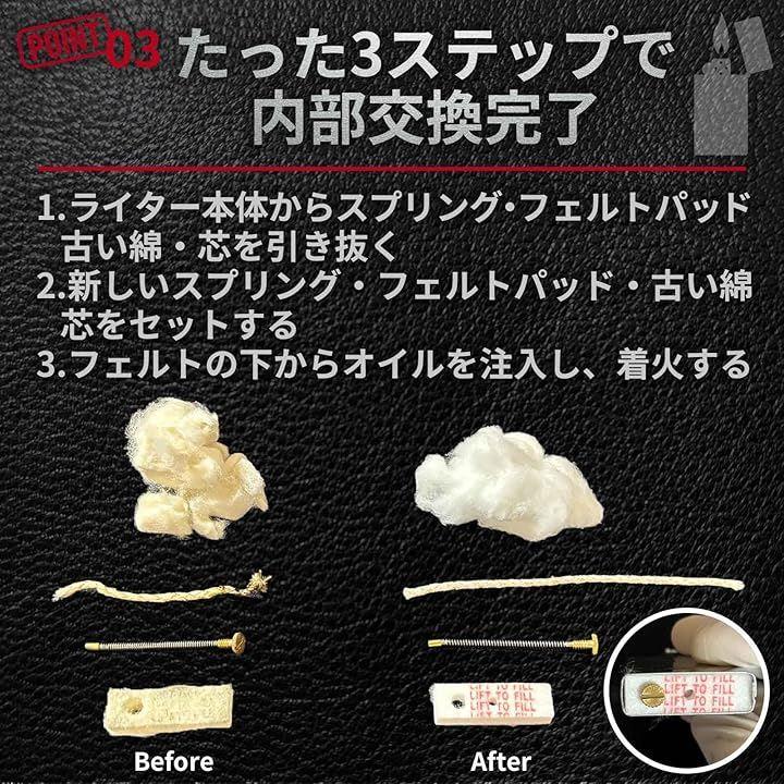 ウィック芯3本、約6.3g(約3回分)のコットン、フェルトパッド、フリントスプリングが揃った、オイルライター用の便利な補修パーツセットです。