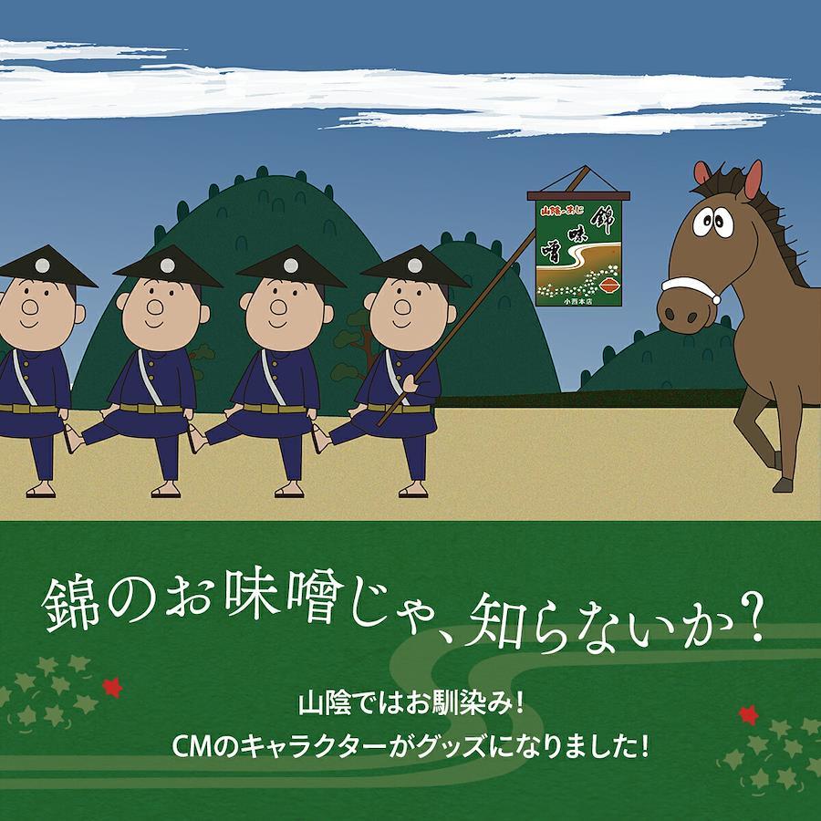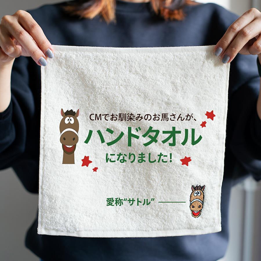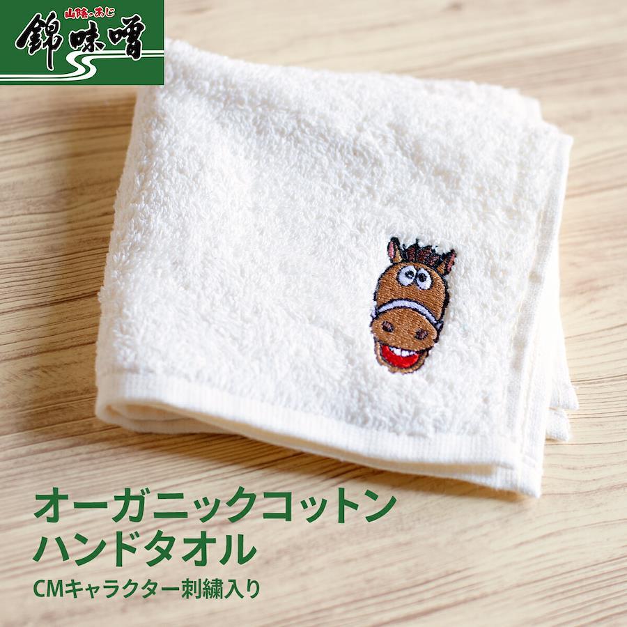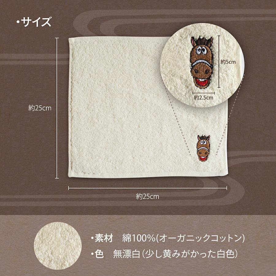 錦味噌のCMに出演しているお馬さんがハンドタオルになりました。素材は綿100%(オーガニックコットン)、色は無漂白です(少し黄みがかった白)。サイズは縦横25cmの正方形です。