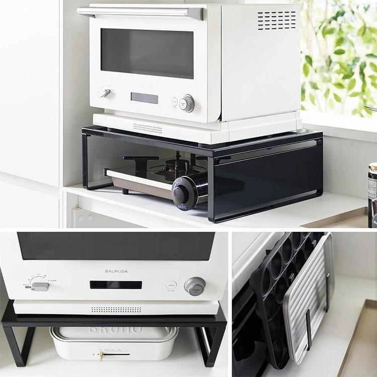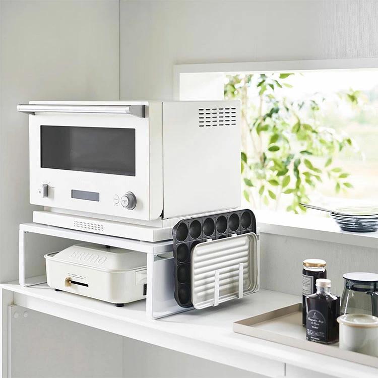 【オーブンレンジラック】置き場に困るホットプレートやカセットコンロの収納にピッタリです。縦にスペースを作ることで、見た目もスッキリ収納できます。スチールパネルは、キッチンレイアウトに合わせて左右どちらでも取り付け可能です。別売りのキッチントレーホルダー2個組を追加して、オーブンやホットプレートの天板をまとめて収納するのもおすすめです。